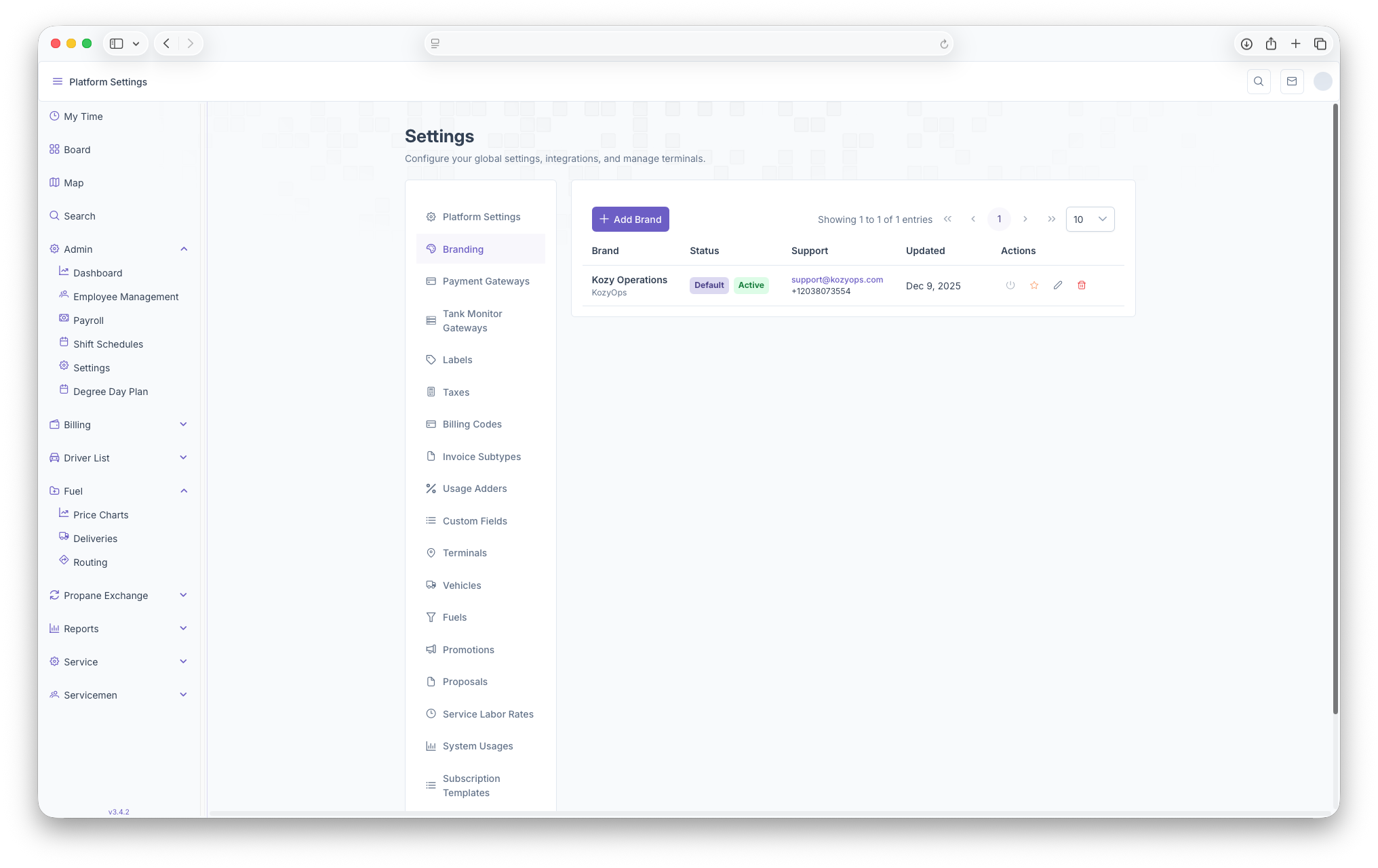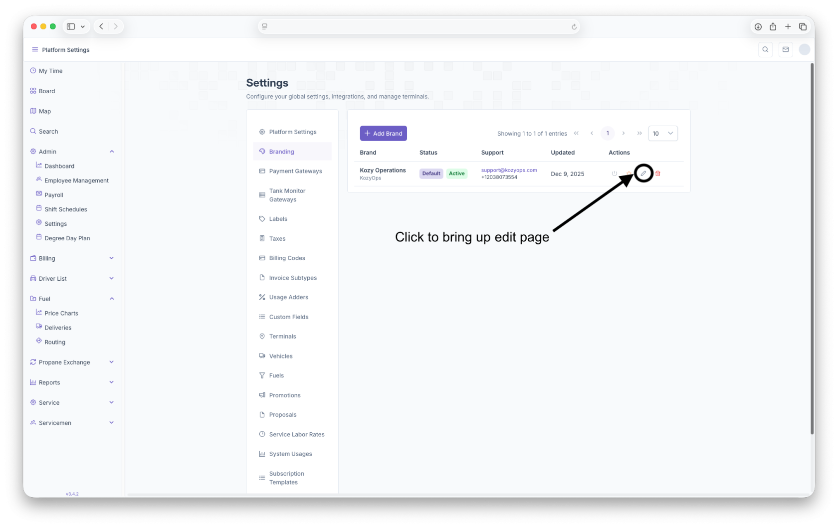 The page displays with any brands that have already been created and shows The Brand, Status, Support, when it was last Updated and Actions that can be taken on the brand. New Brands can also be added here as well.