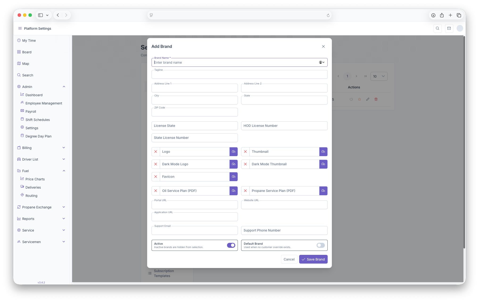 Once finished filling out the information, clicking on the Save Brand button will now upload the new brand for the company's use. Clicking cancel will close out the page and any information put in will be deleted.