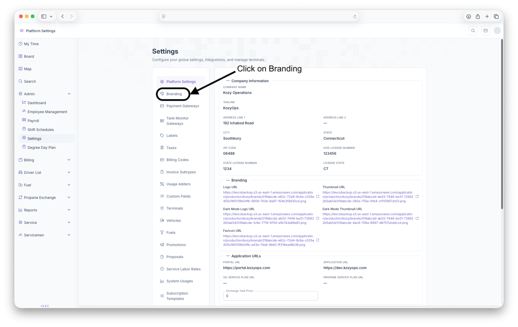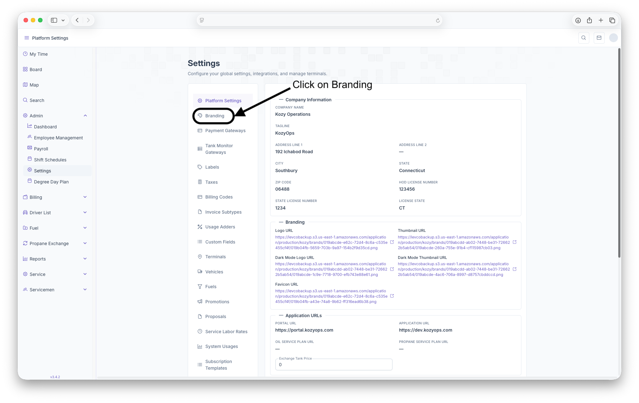 The Branding page is where brands can be created for the company or for any sub-companies owned by them. Branding is used to show The Companies Logo and Name, which are shown when sending emails or giving invoices to customers. To reach the Branding page click on the Admin Dropdown, then click on settings. Once on the Settings page, click on the Branding tab to open the page. Clicking on the three bars on the top left corner of the page will expand the side menu showing more detail for easier navigation
