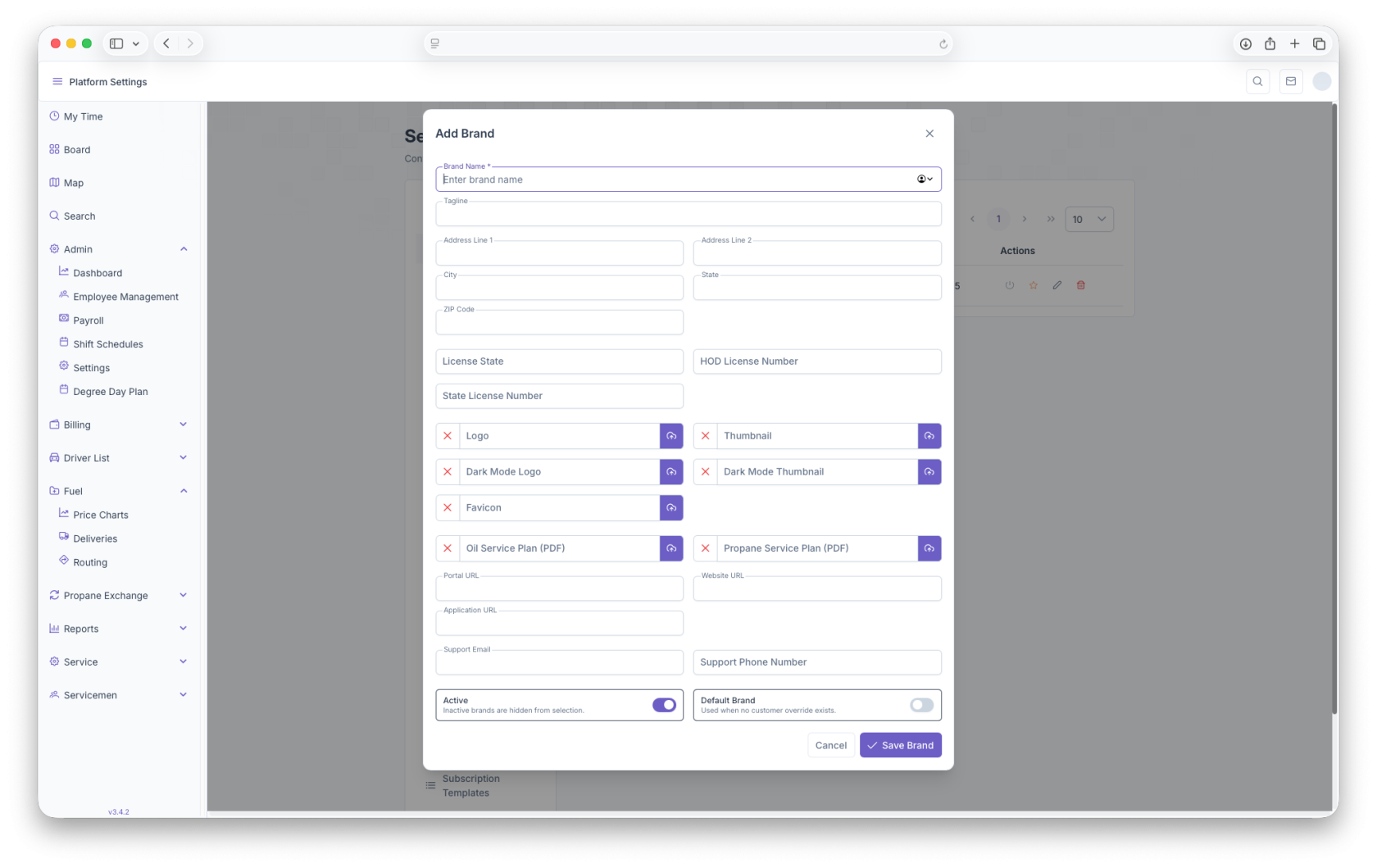 Clicking on the +Add Brand button brings up the add brand page if any brands need to be added. The page can then be filled with all the information needed in order to create a brand for the company. The Following fields will then appear to be filled out