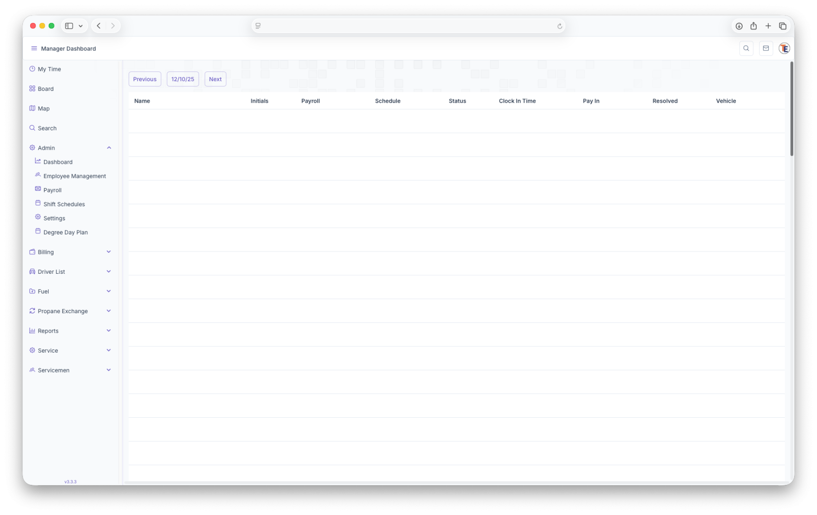 The Dashboard generates an Employee List and their status' for the current day selected. To reach this page, click on Admin on the side menu then click on Dashboard. Clicking on the three bars on the top left corner of the page expands the side menu to show more detail allowing for easier navigation. The page generates with todays date, but other days can be selected by clicking on the Previous or Next buttons next to the date. The page then shows a list of the following, Employee Name, Employee Iitials, Payroll, Schedule, Status, Clock in Time, Pay In, Resolved and Vehicle. The list is organized alphabetically by the Employees first name.