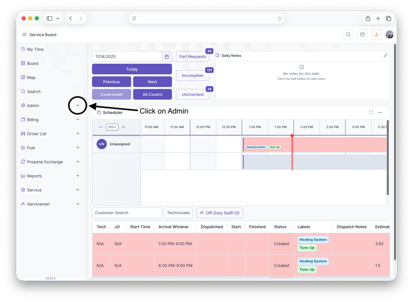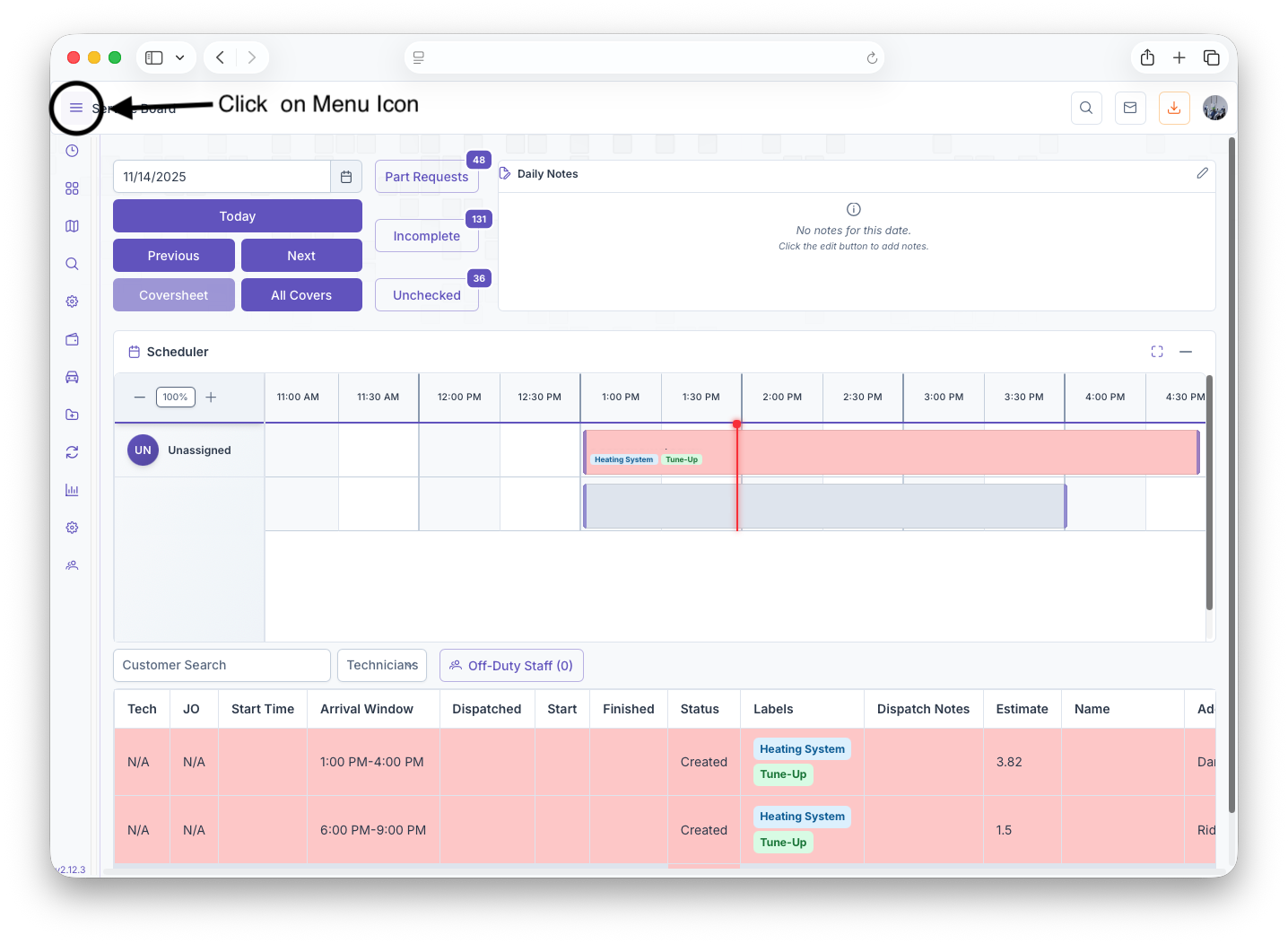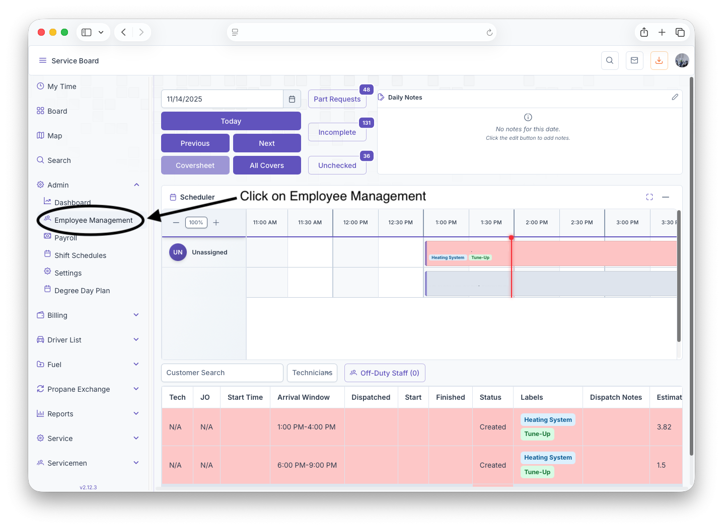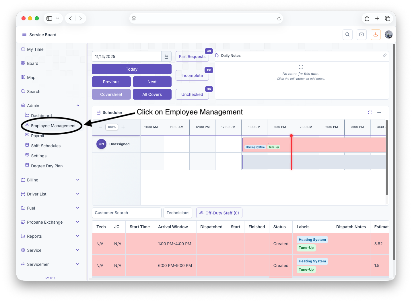 The Employee Management page can be used to add a new employee to the system or edit a current one. To reach the Employee Management page, click on The Admin dropdown on the side menu then click on Employee Managaement. Clicking on the three bars on the top let corner on the page expands the side menu to show more detail allowing for Easier Navigation.