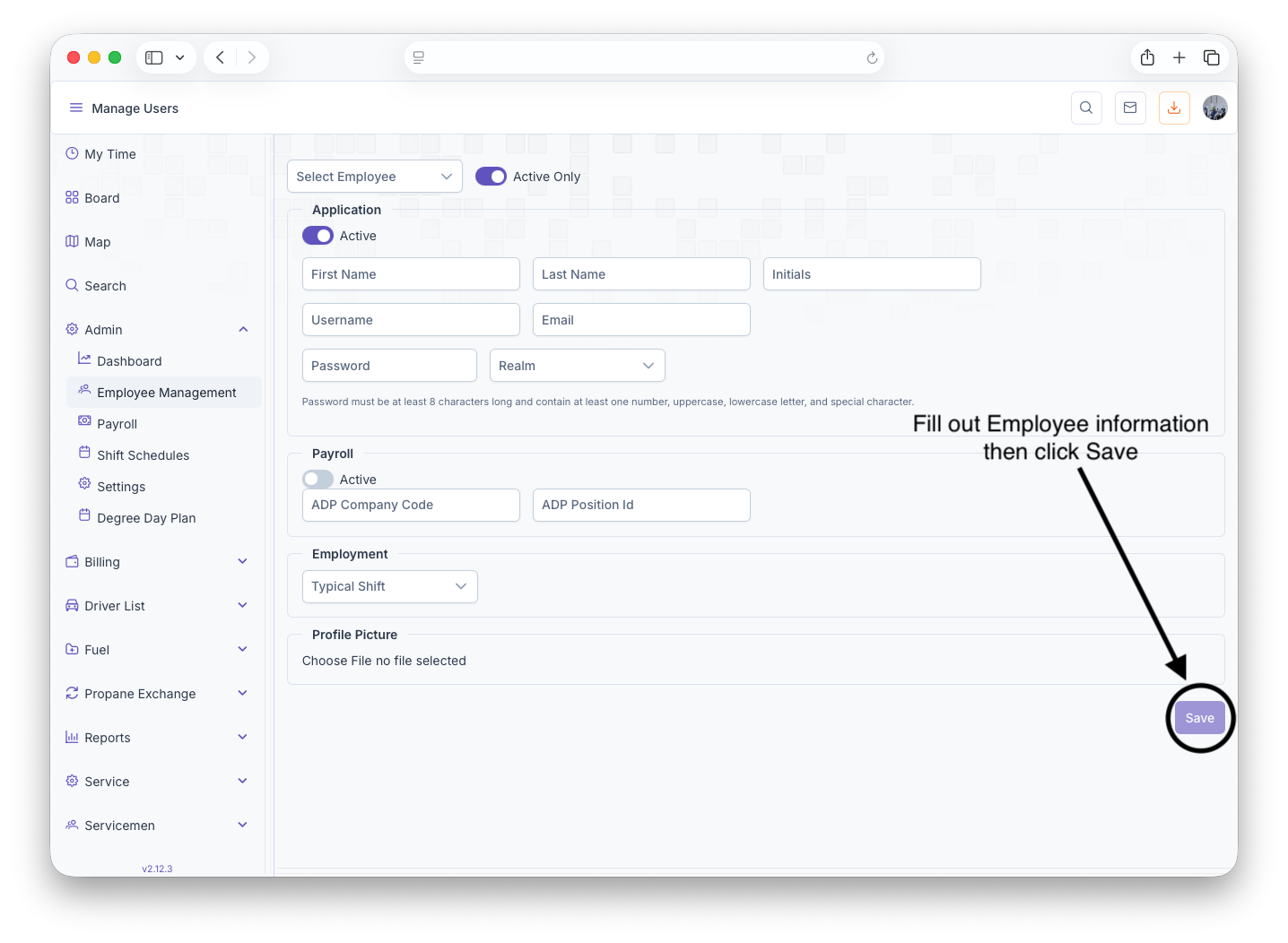 - Payroll: The Employees payroll status can be toggled to active or inactive, can fill out the ADP Company Code and the ADP Position ID