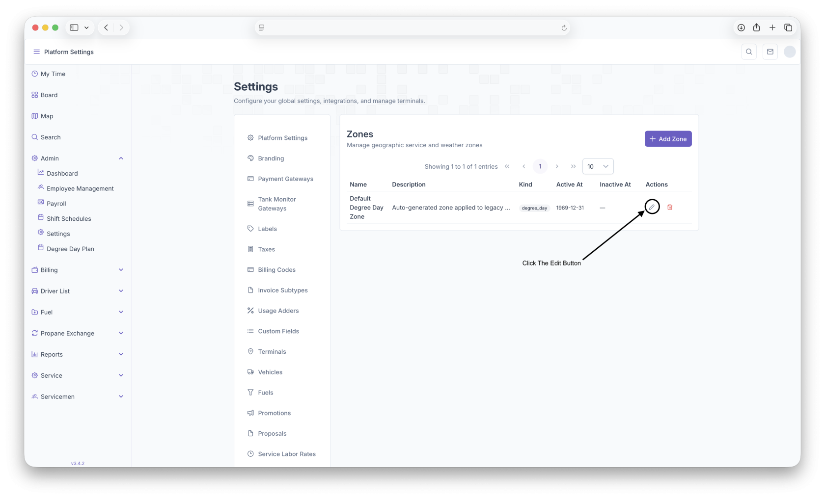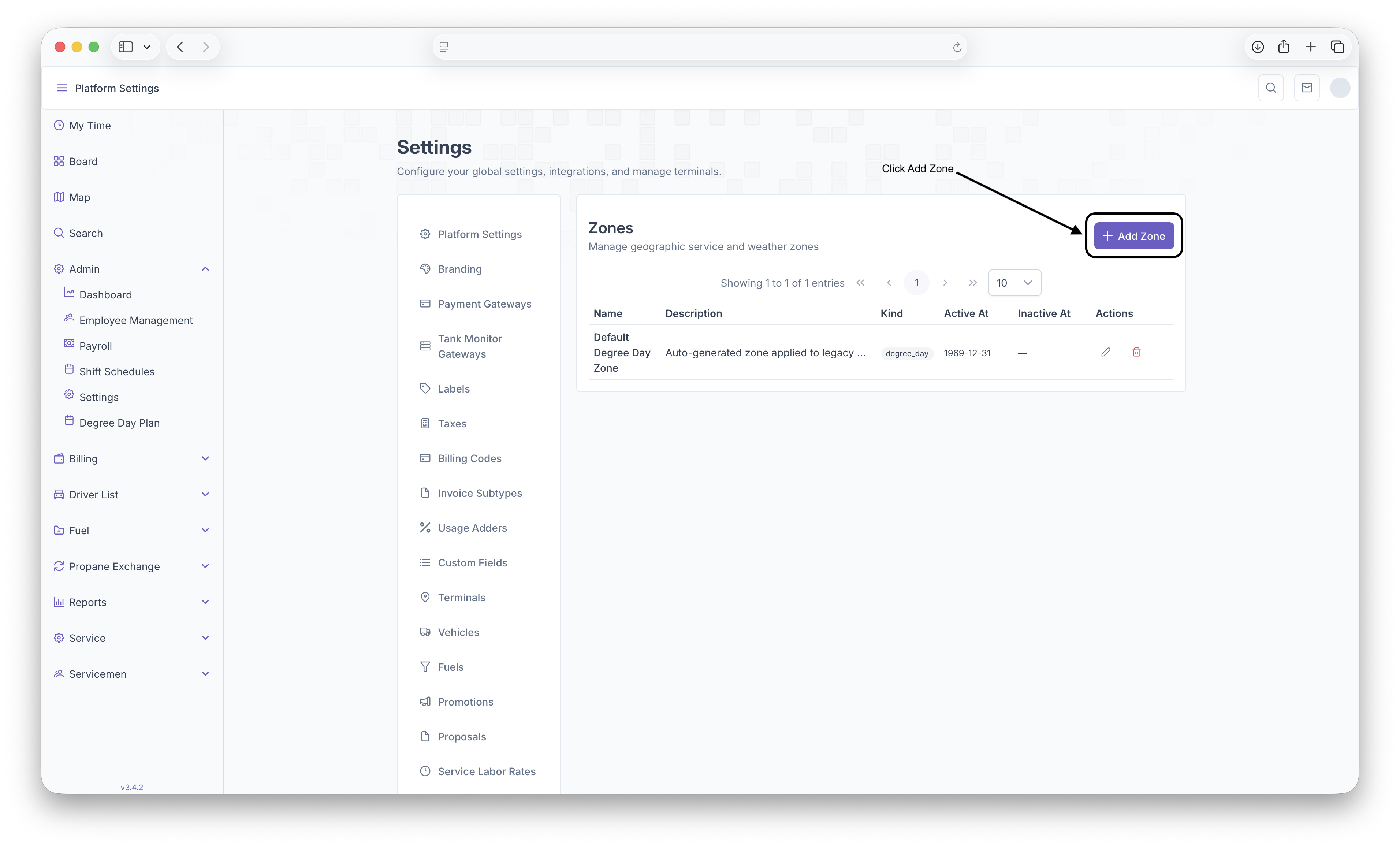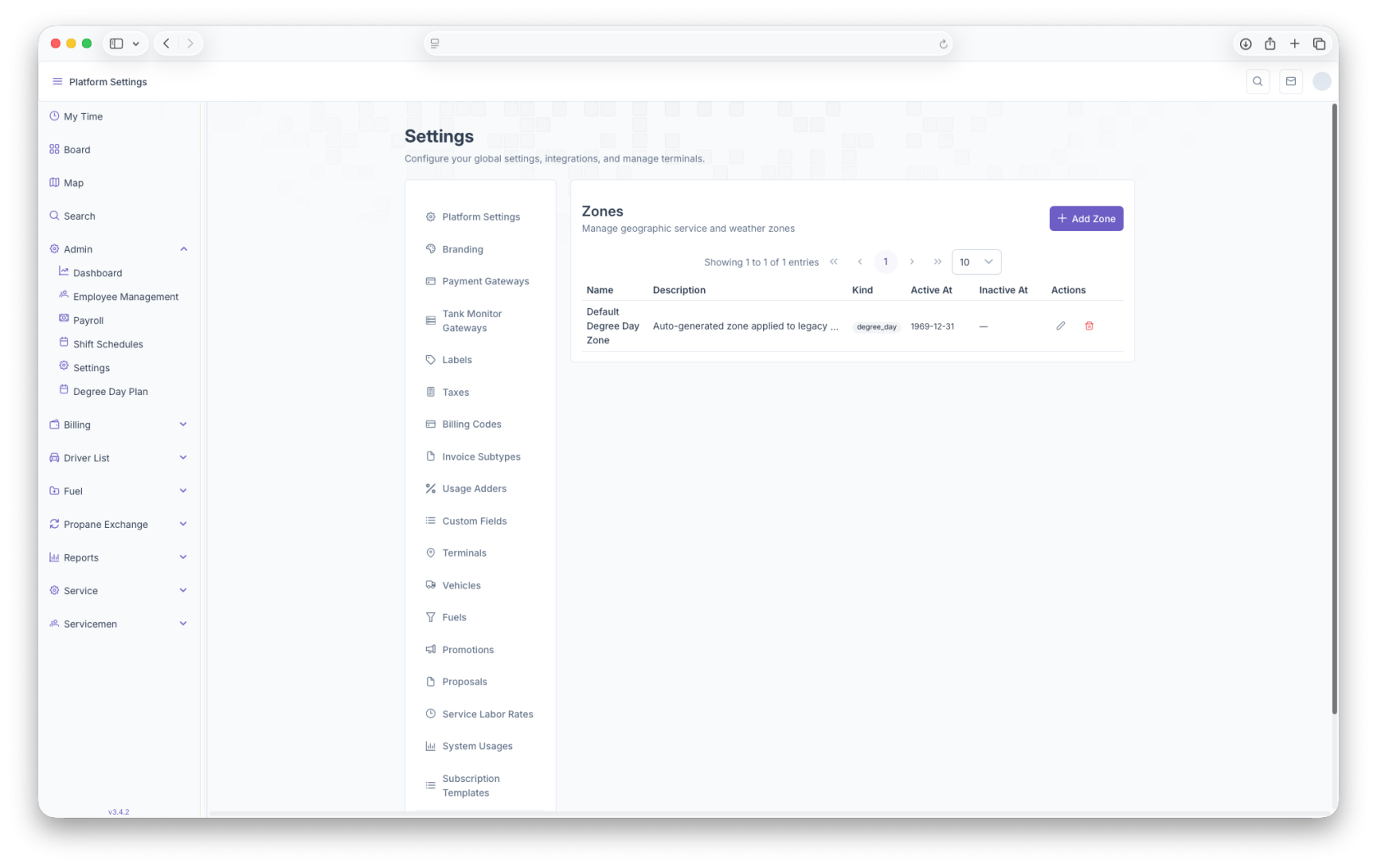 The Zones page is where Zones can be created to show locations that are covered under a specific zone umbrella. These Zones can range anywhere from being regional to what locations only use specific fuels. To reach the Zones page, click on Admin Dropdown on the side menu then click on Settings. Once on the settings page, scroll to the bottom of the page and click on Zones