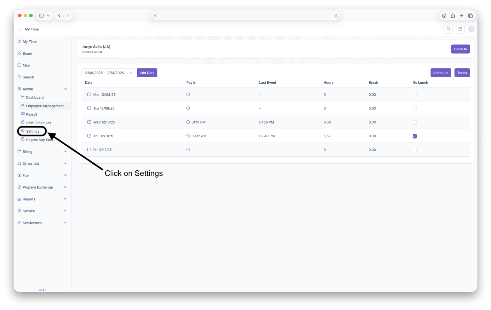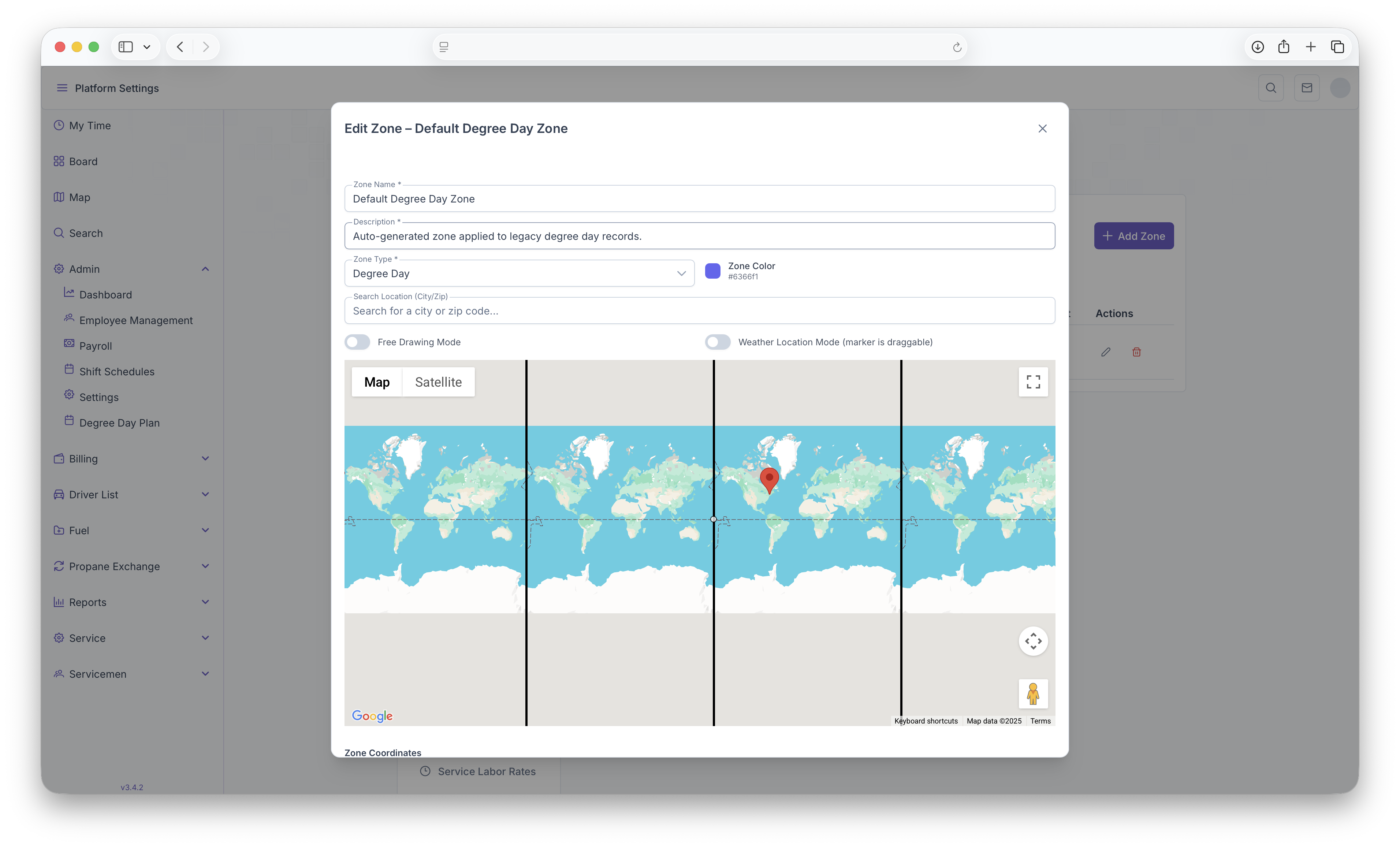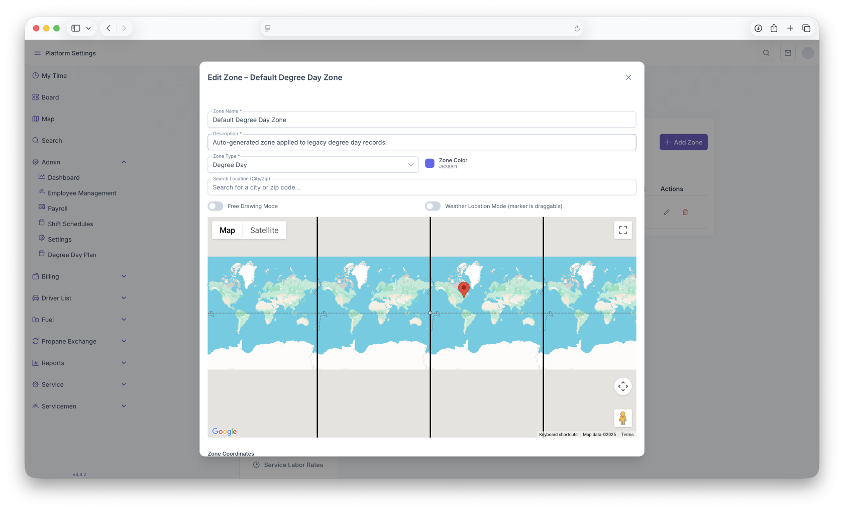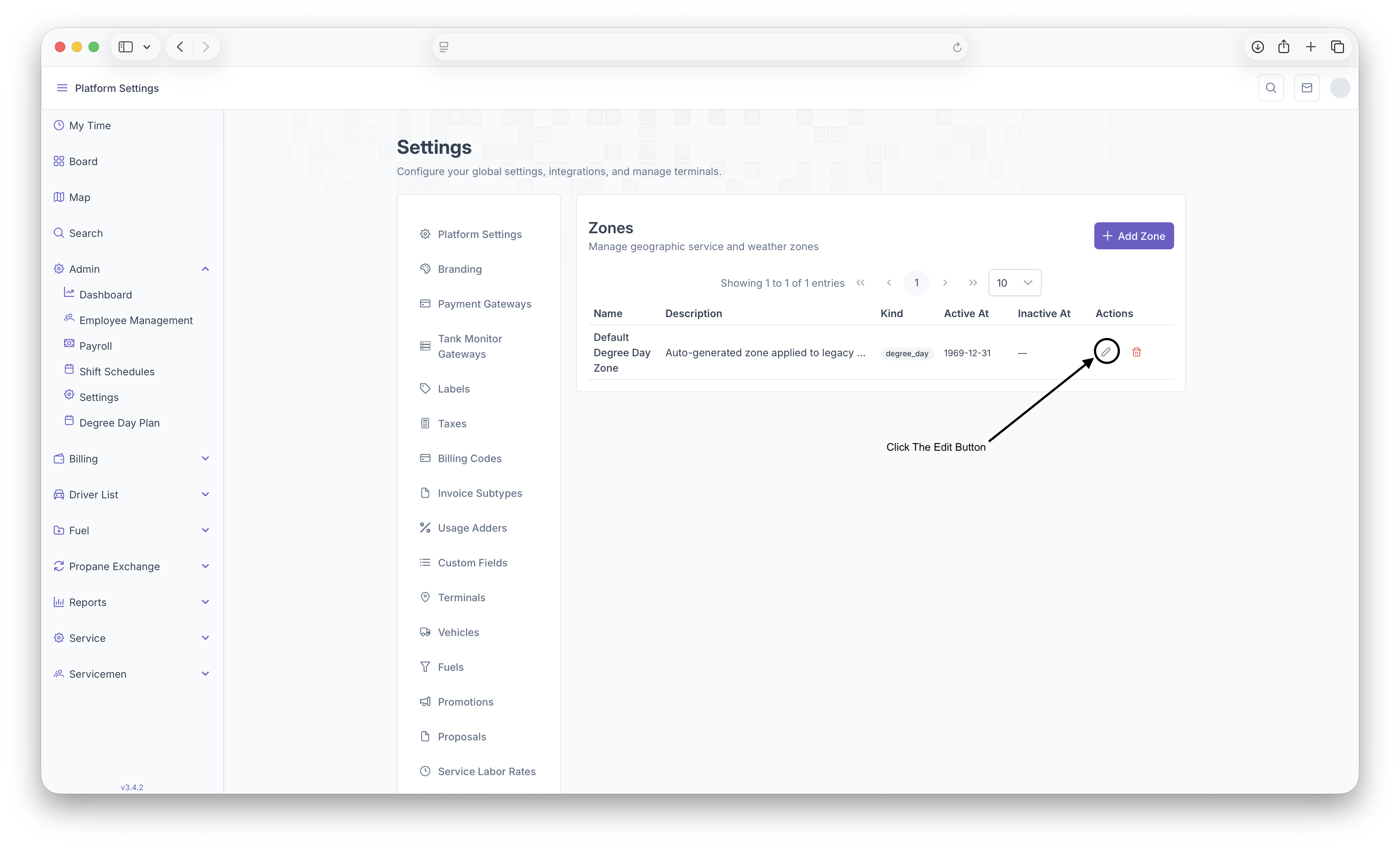 The Zones page is where Zones can be created to show locations that are covered under a specific zone umbrella. These Zones can range anywhere from being regional to what locations only use specific fuels. To reach the Zones page, click on Admin Dropdown on the side menu then click on Settings. Once on the settings page, scroll to the bottom of the page and click on Zones