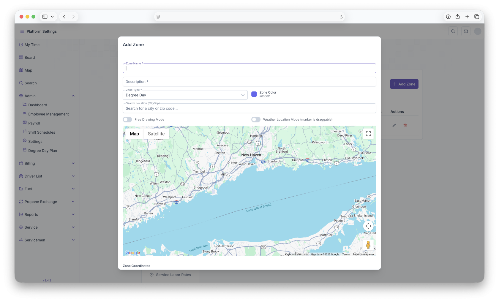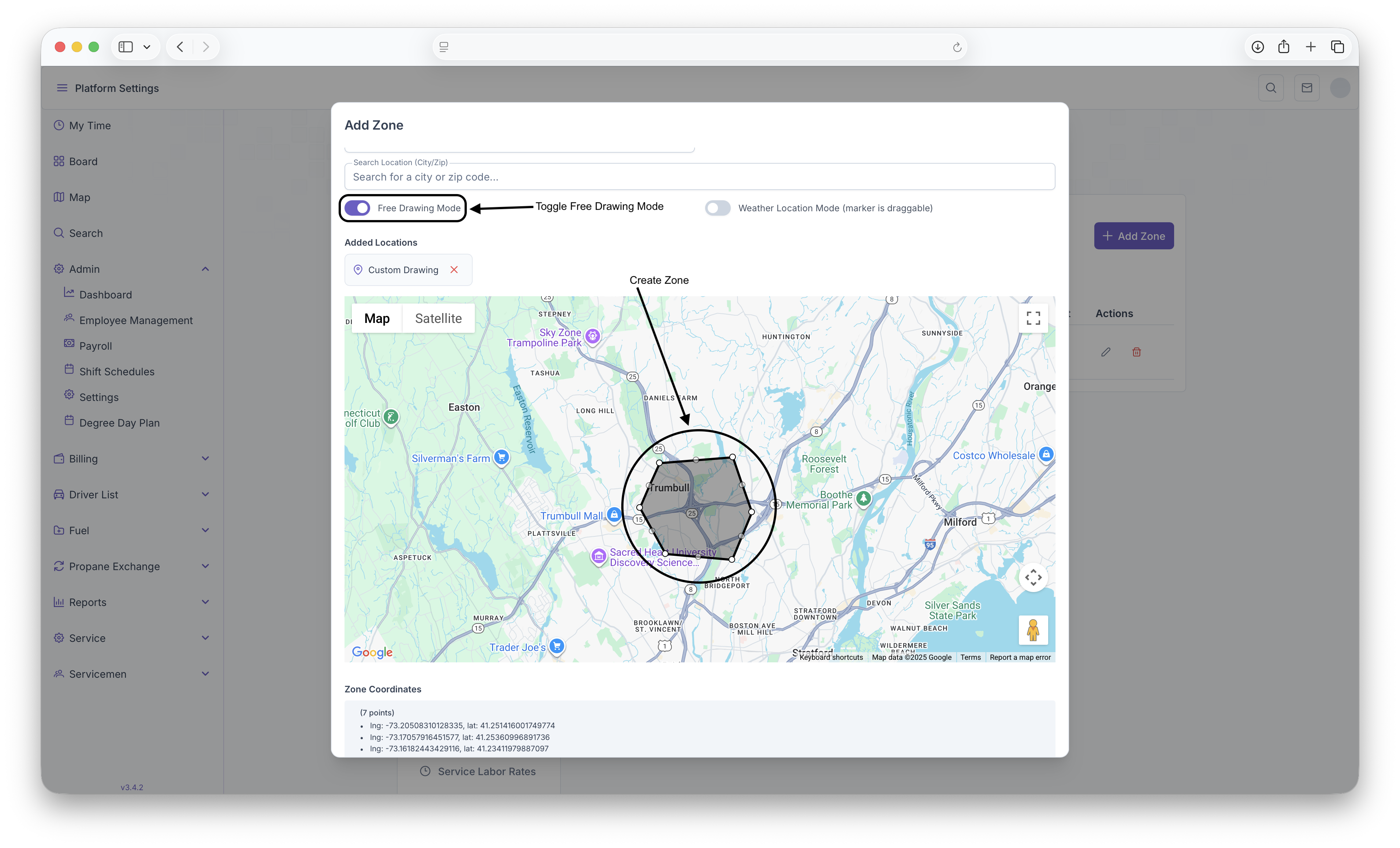 - After filling out those fields, next will be creating the zone itself on the map. Note that if a zip code or city are selected, a zone will be auto generated, this zone can be edited
