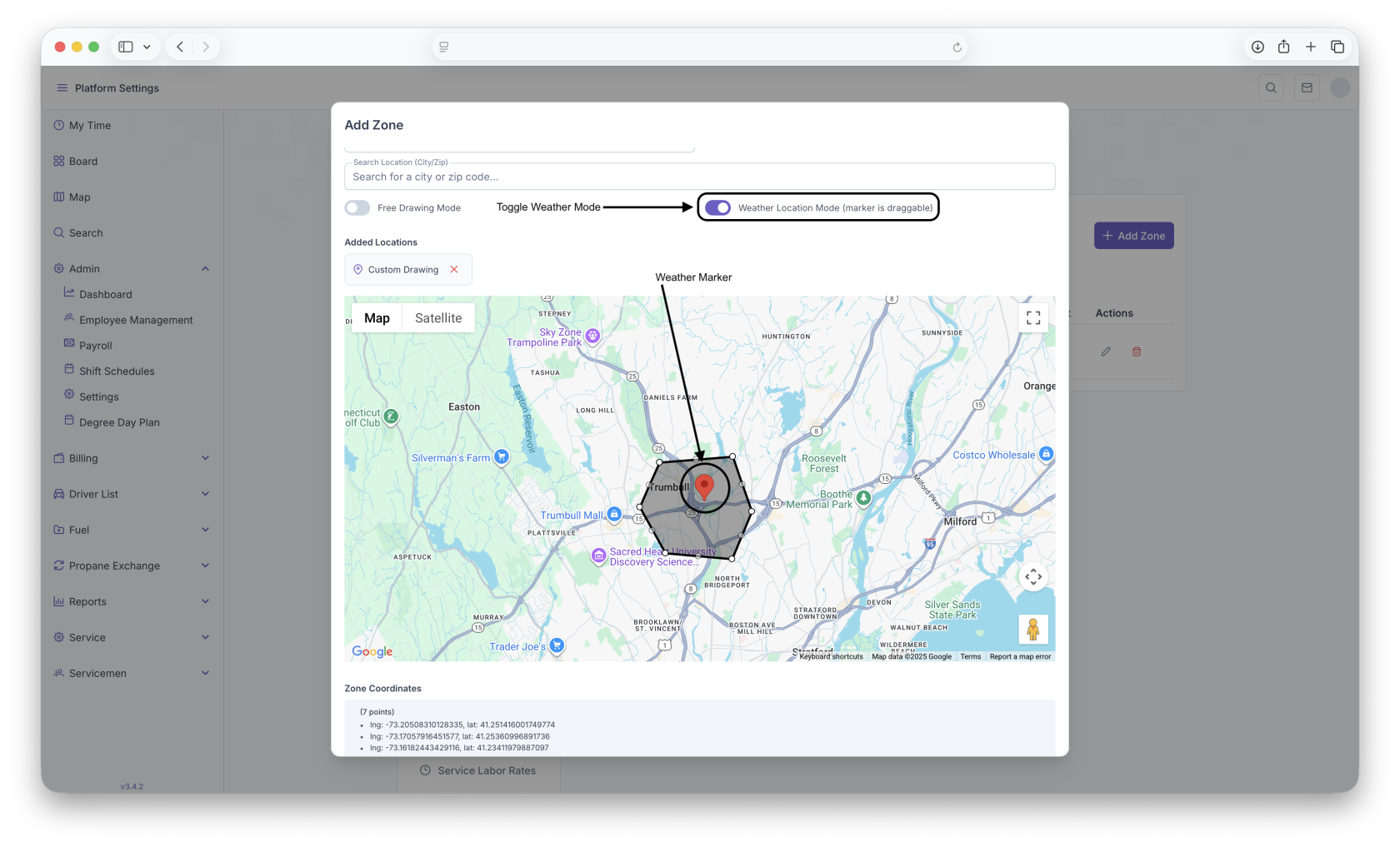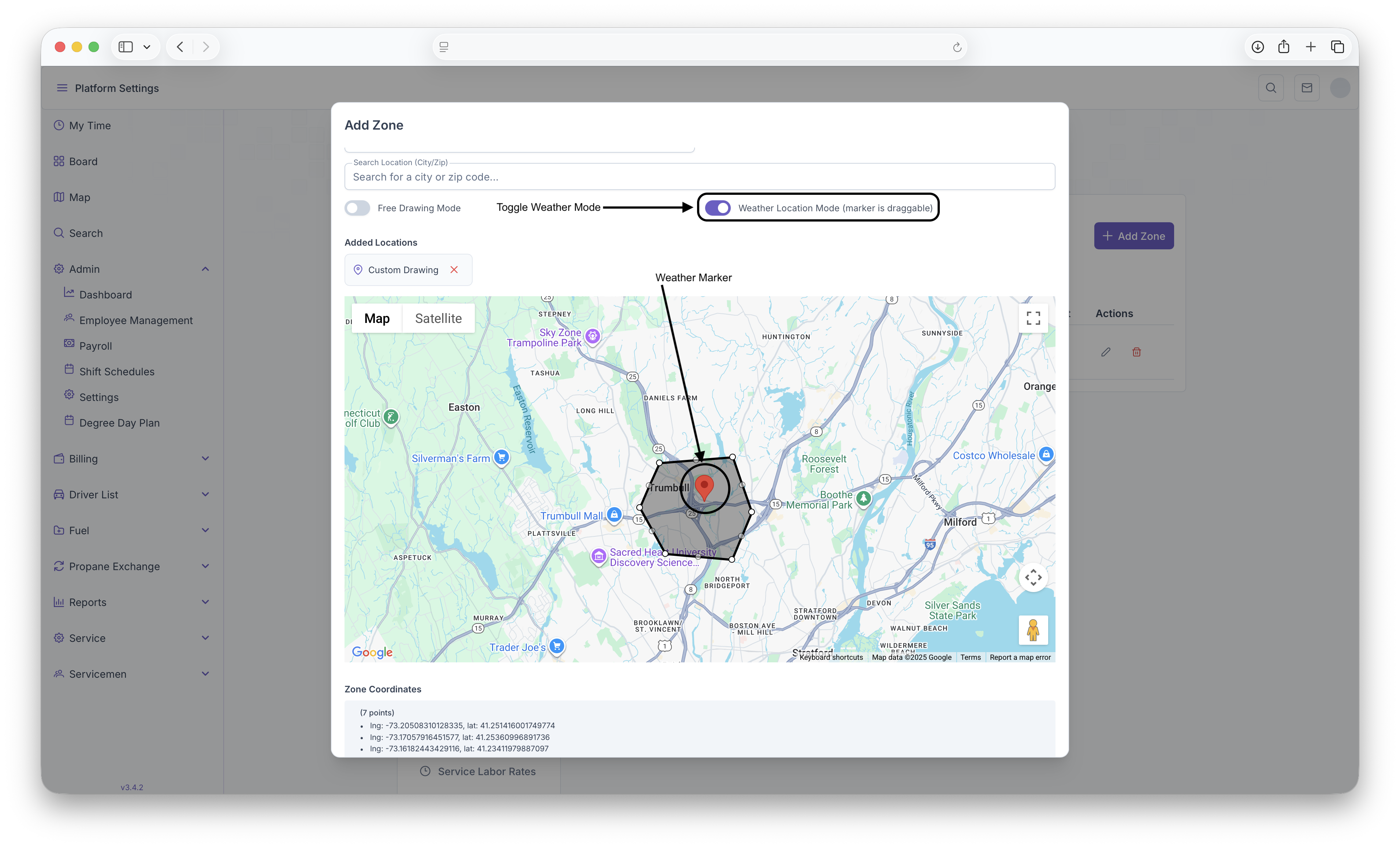 - Once desired zone is created, a Weather Location Marker must be placed on the map by toggling on the Weather Location Mode and clicking on the map.