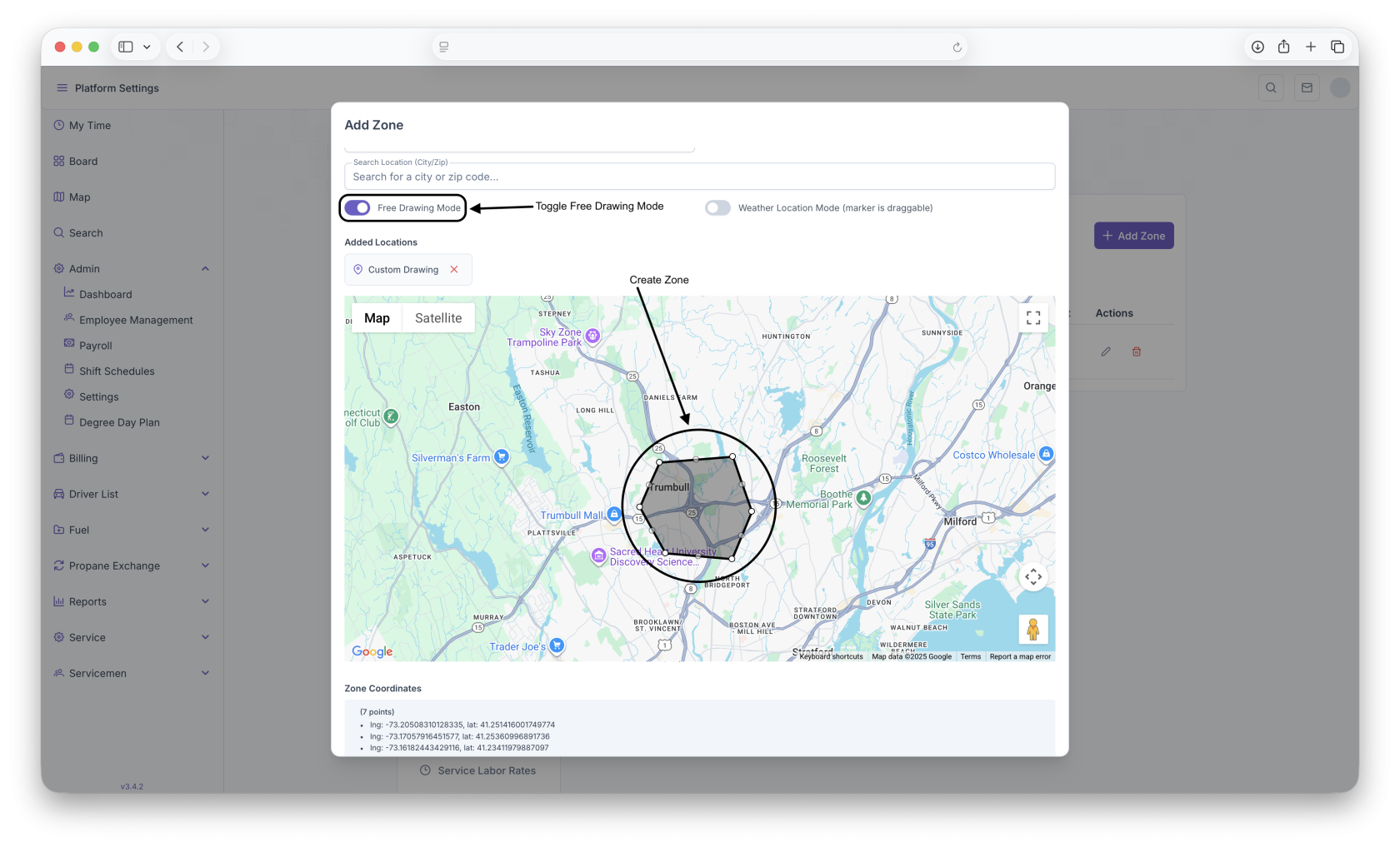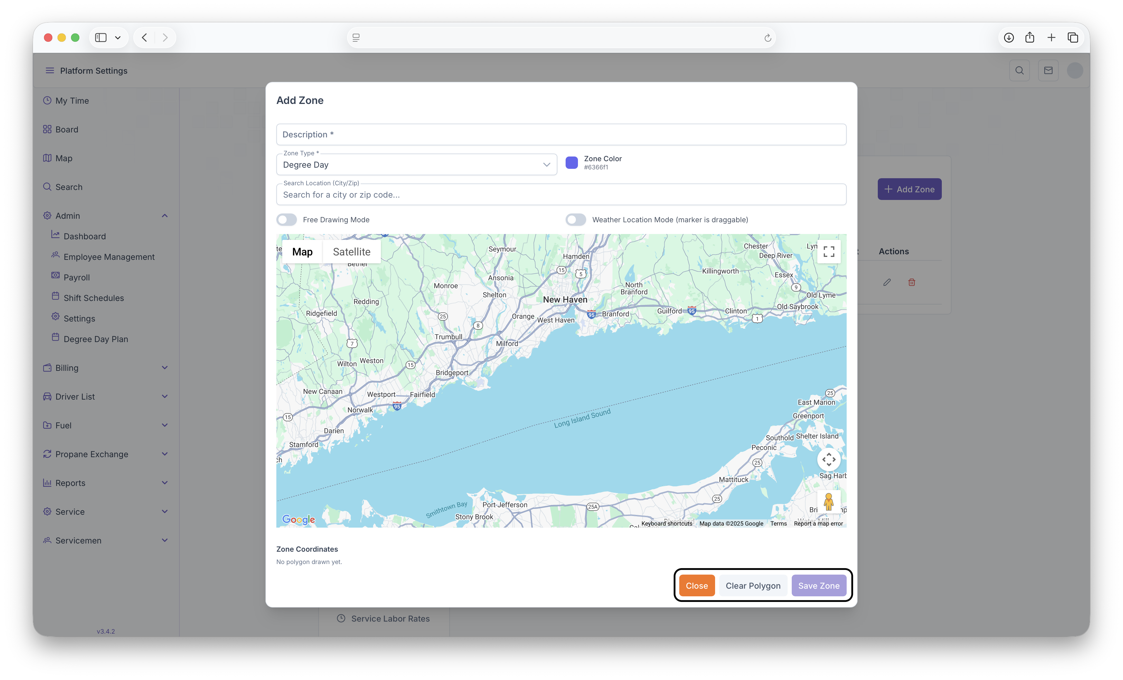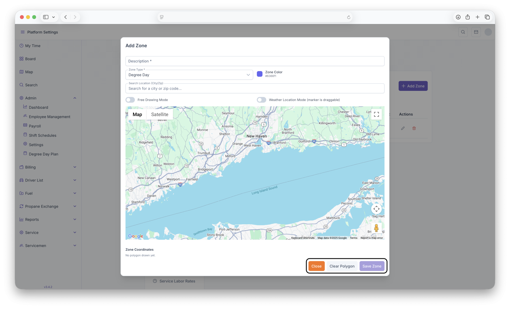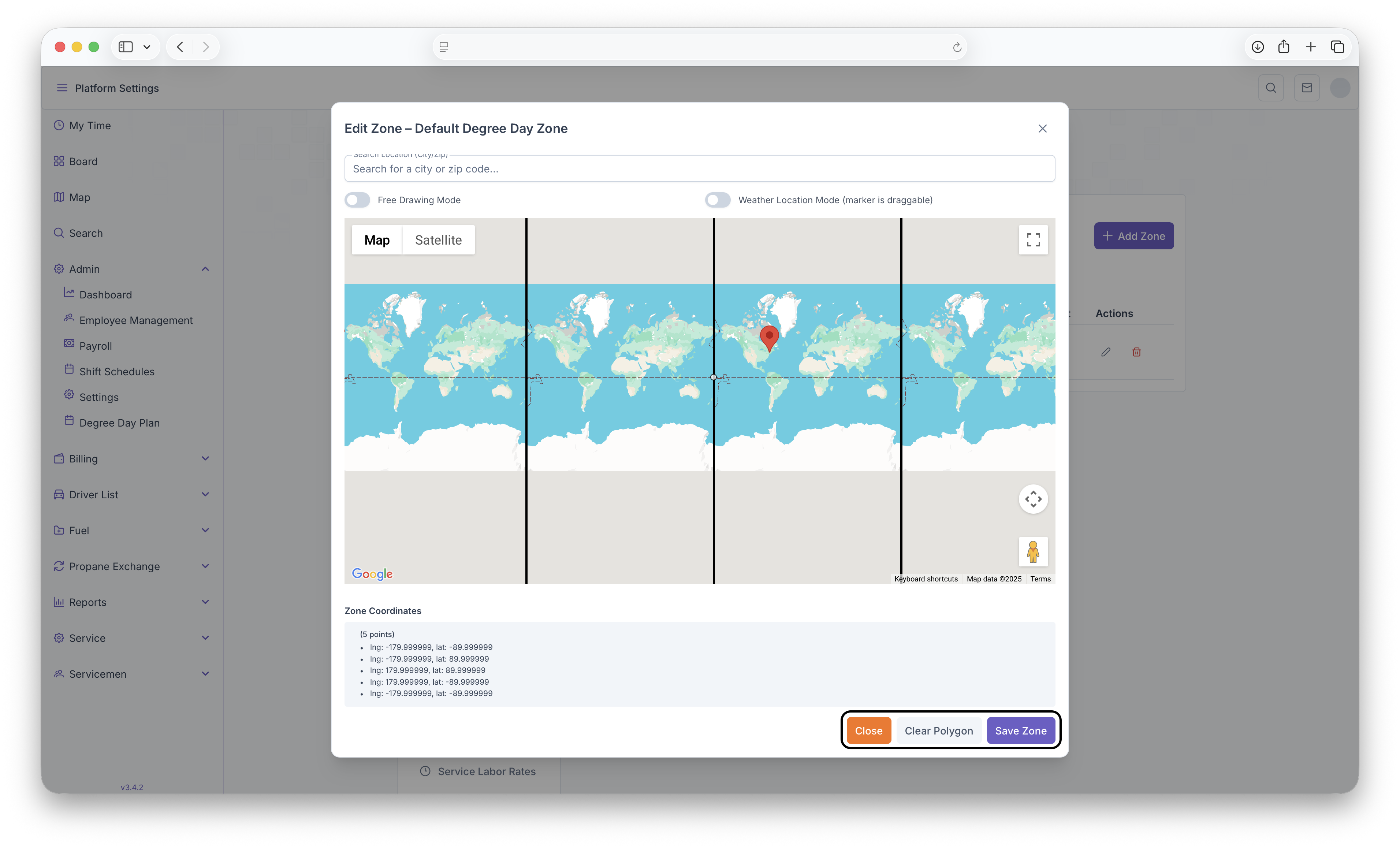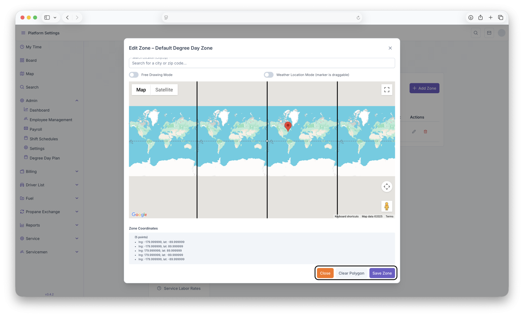 - Once that's all finished, Zone coordinates will be generated to shows all coordinates for every point placed on the map. Once everything is filled out and looks satisfactory, clicking on the Save Zone button will save the zone. Clicking on the Clear Polygon button will clear the ploygon to start over again and clicking Close will close the window, deleting any information that was filled out.