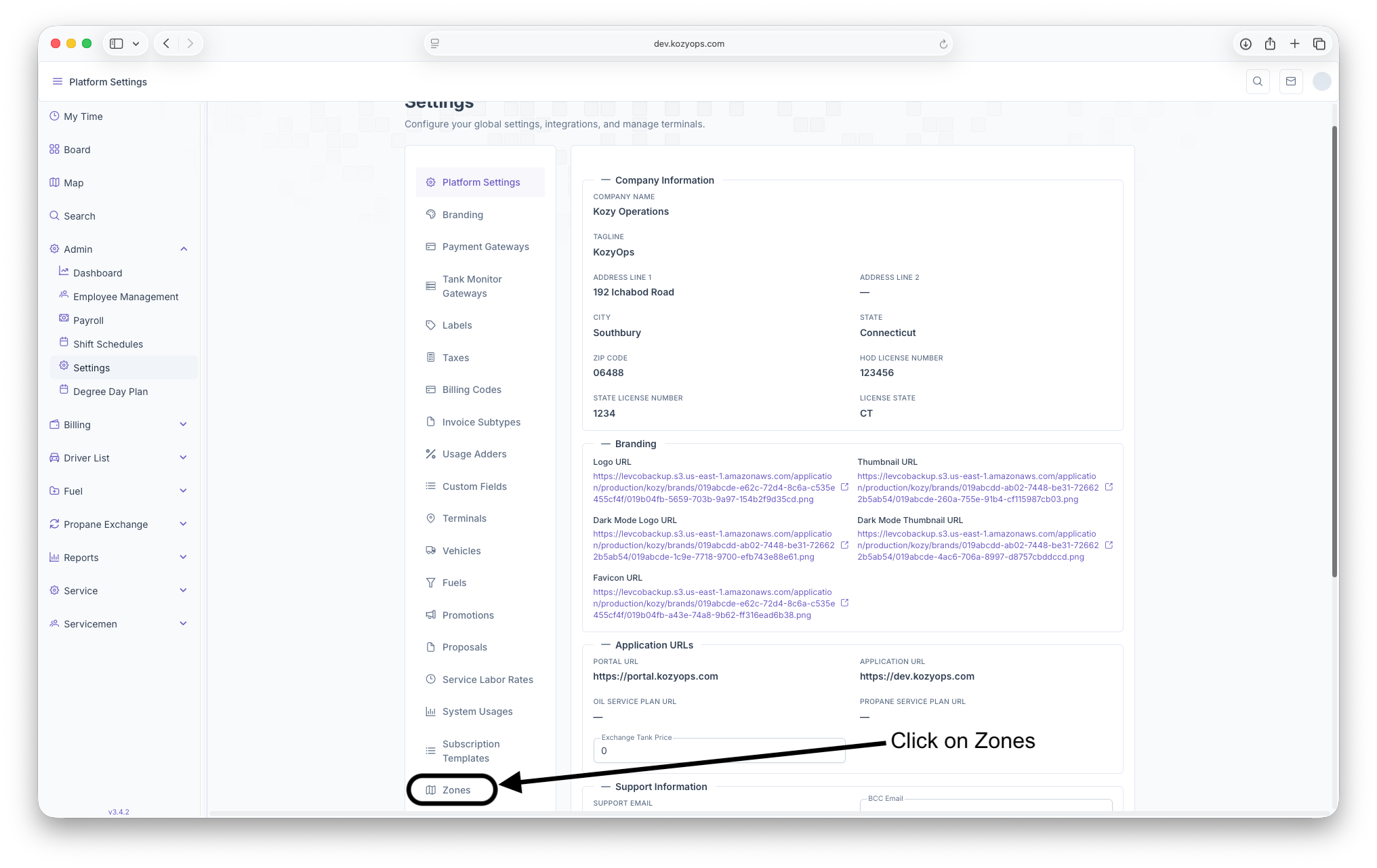 The Zones page is where Zones can be created to show locations that are covered under a specific zone umbrella. These Zones can range anywhere from being regional to what locations only use specific fuels. To reach the Zones page, click on Admin Dropdown on the side menu then click on Settings. Once on the settings page, scroll to the bottom of the page and click on Zones