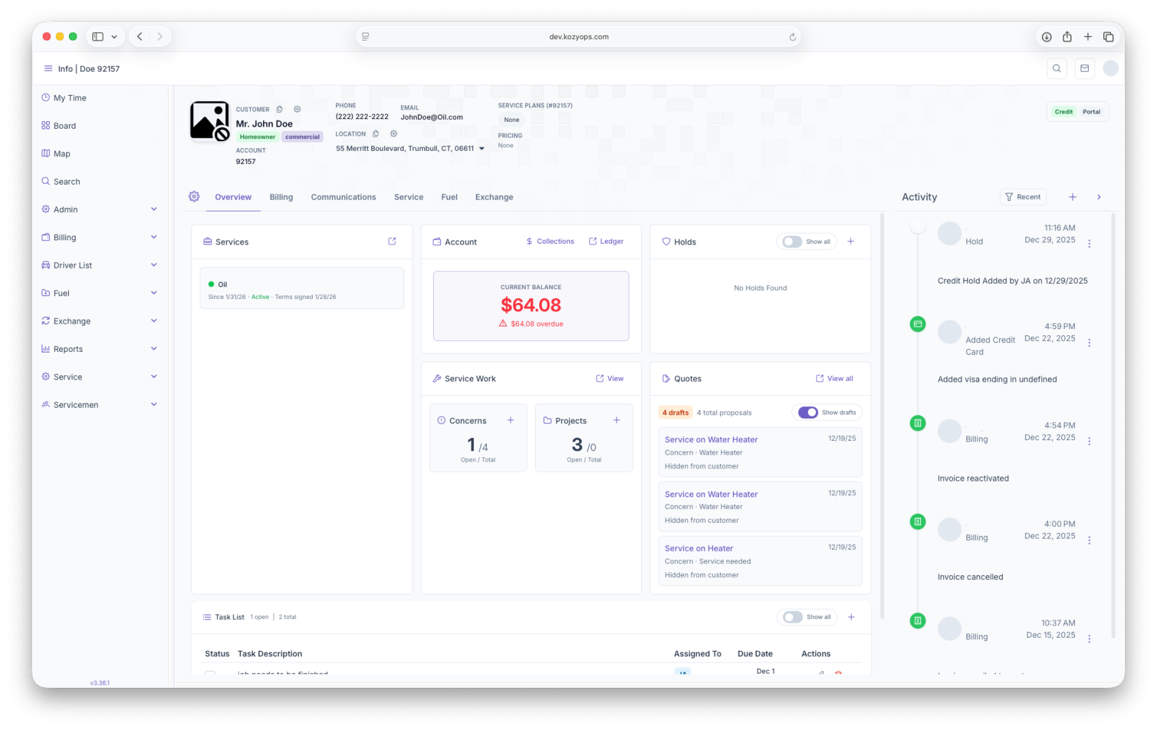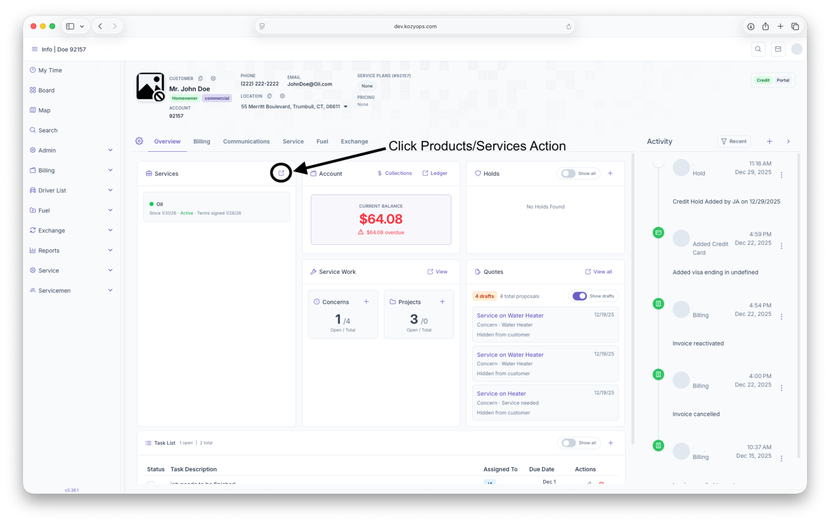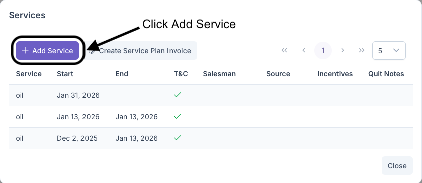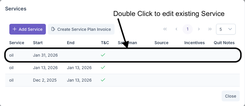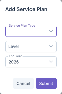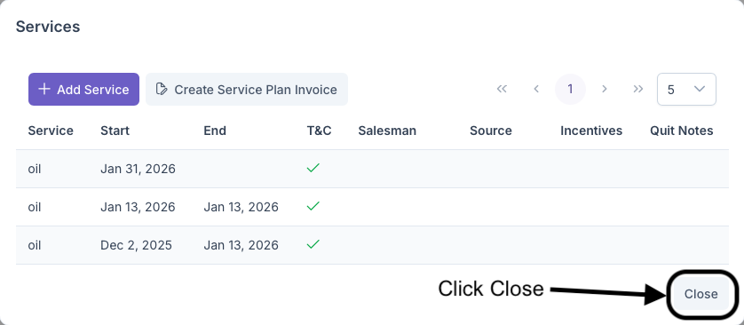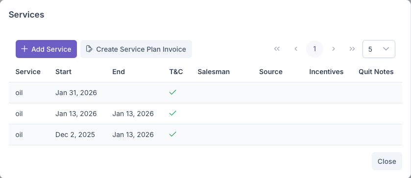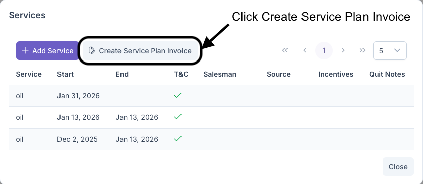 - Create Service Plan Invoice — Opens a small dialog to generate an invoice for a plan