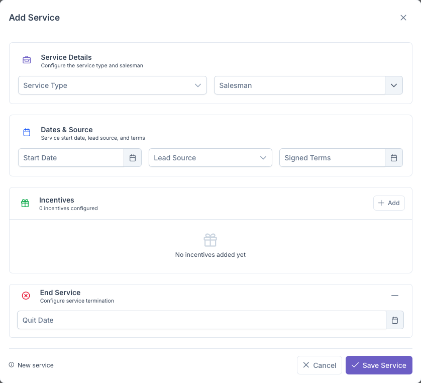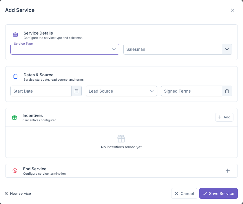 - Tracked with start/end dates, T&C, salesperson, lead source, incentives, and notes