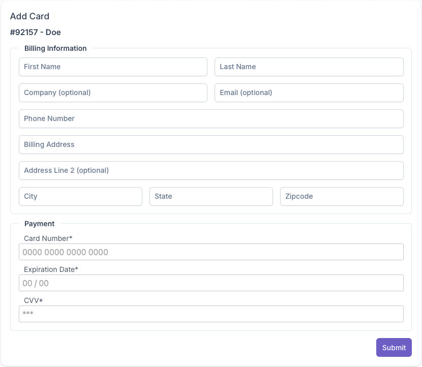 Clicking on the Add button on the top right of the box will bring up the add card page. The following fields must be filled out for a card to be added on to the account