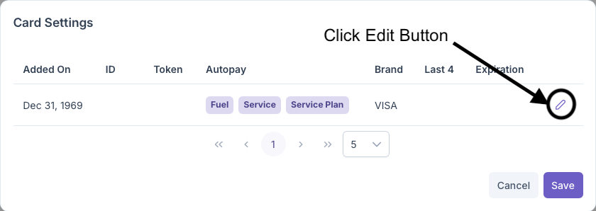 Clicking on the edit button will allow for a card to be edited for Autopay puroses. Once a card is added on to the account, the card itself cannot be edited. The Edit Card popup will then generate, which allows for autopay edits and will show the following information