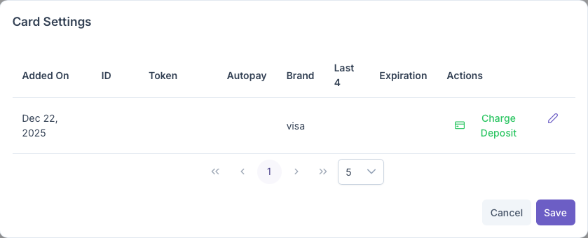 Clicking on the Manage Cards button will bring up the Cards Setting popup. Here all cards on the account can be seen and managed for autopay purposes. The popup will generate with each card as a line item and with the following columns