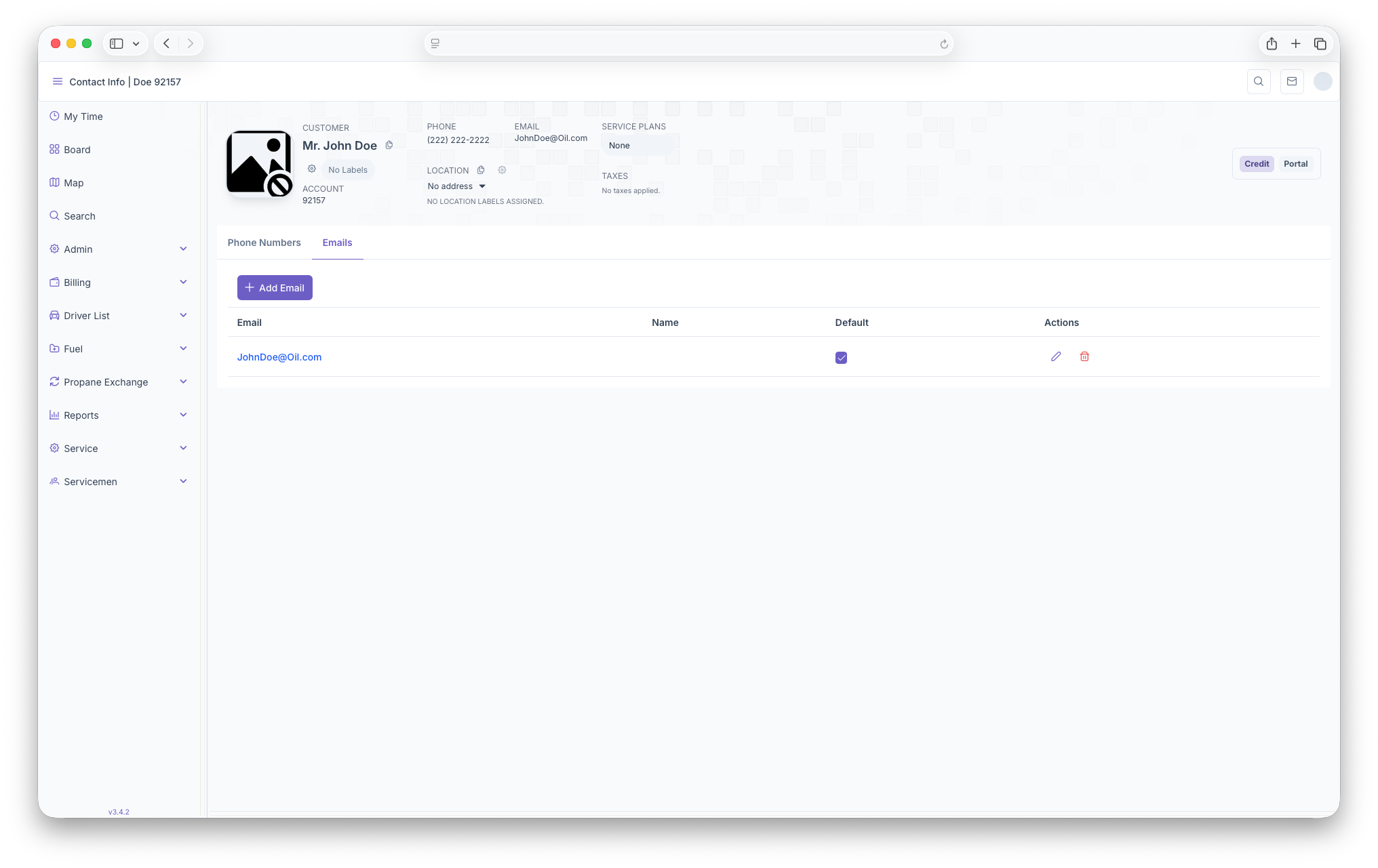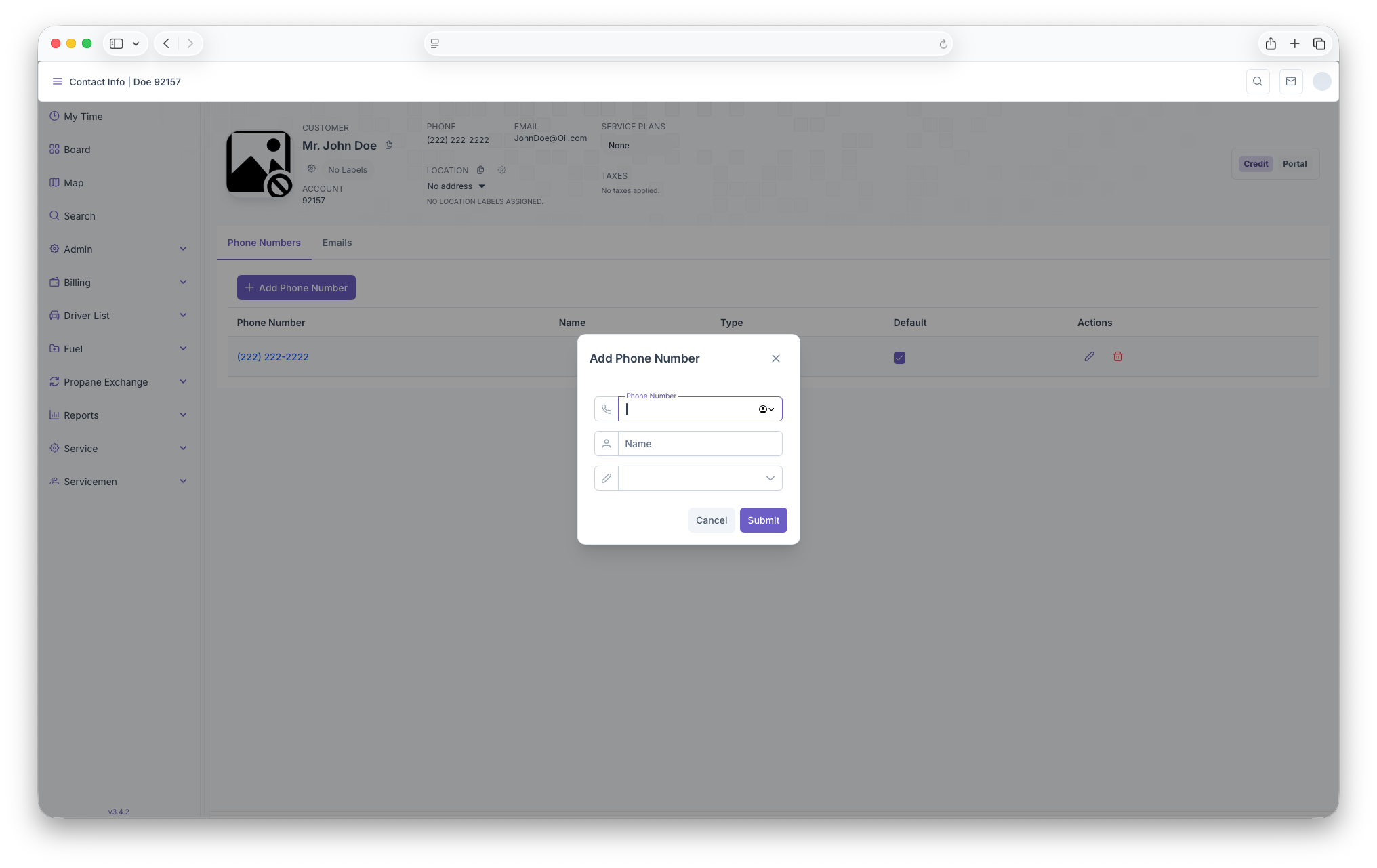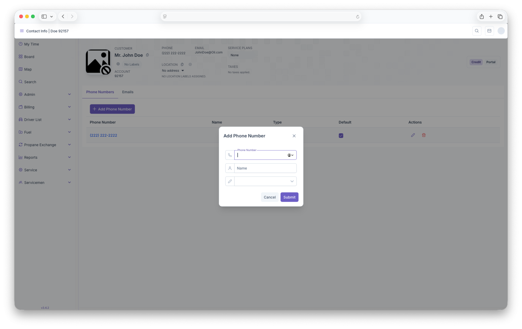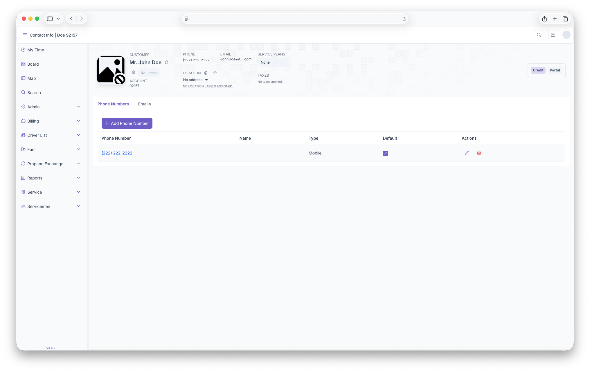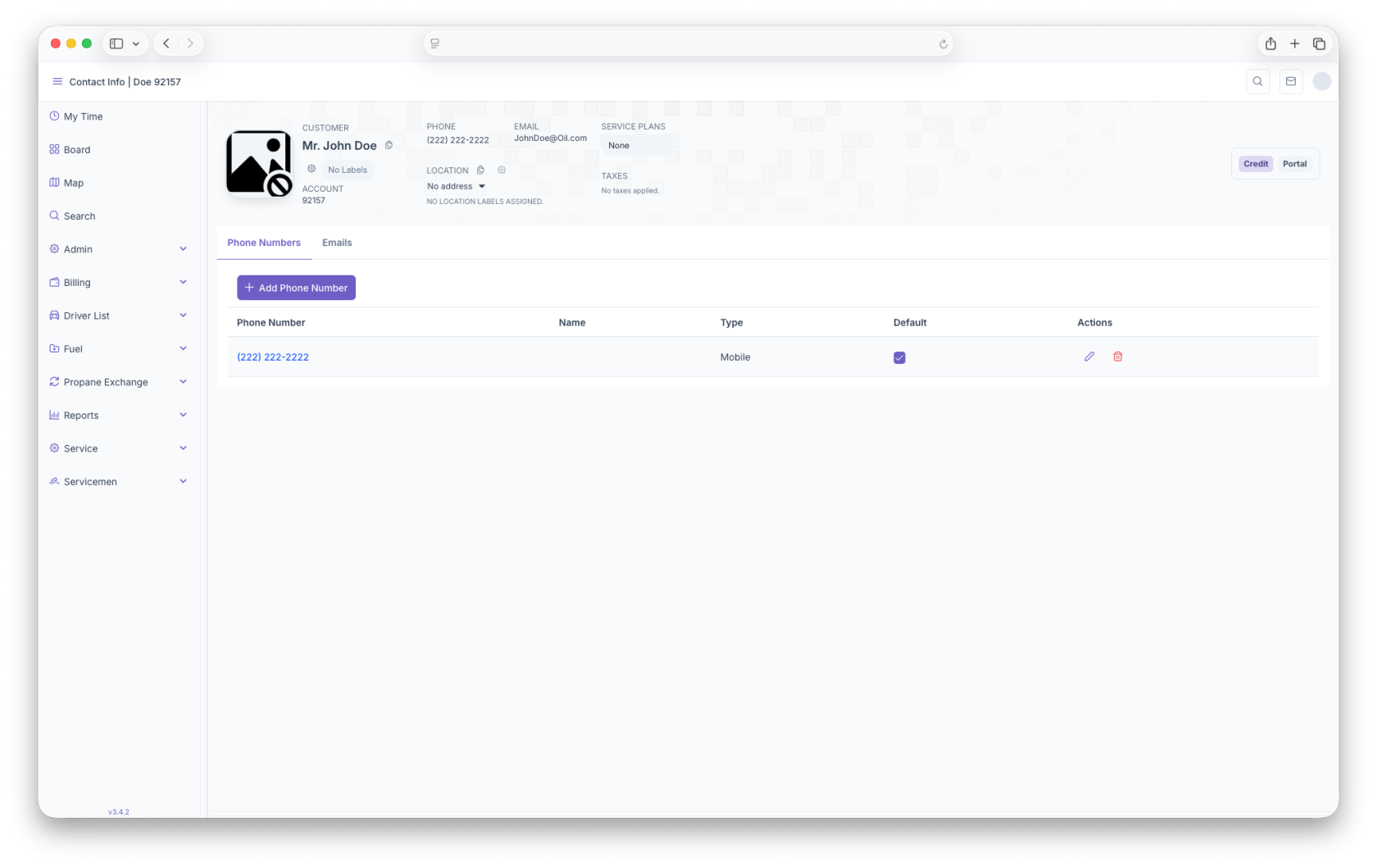 Here, the customers main phone number will be displayed. Clicking on the phone number allows for adding, editing or deleting phone numbers. The page generates in rows that includes the phone number, name, type, default and actions.