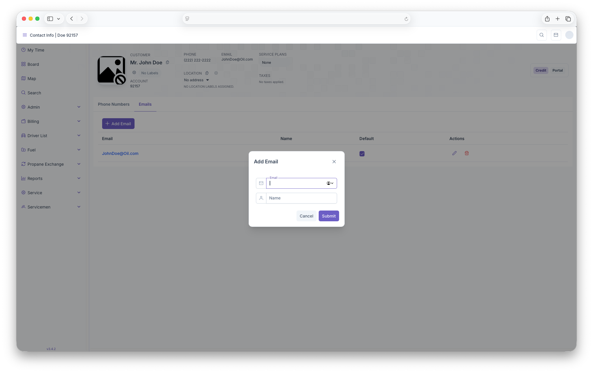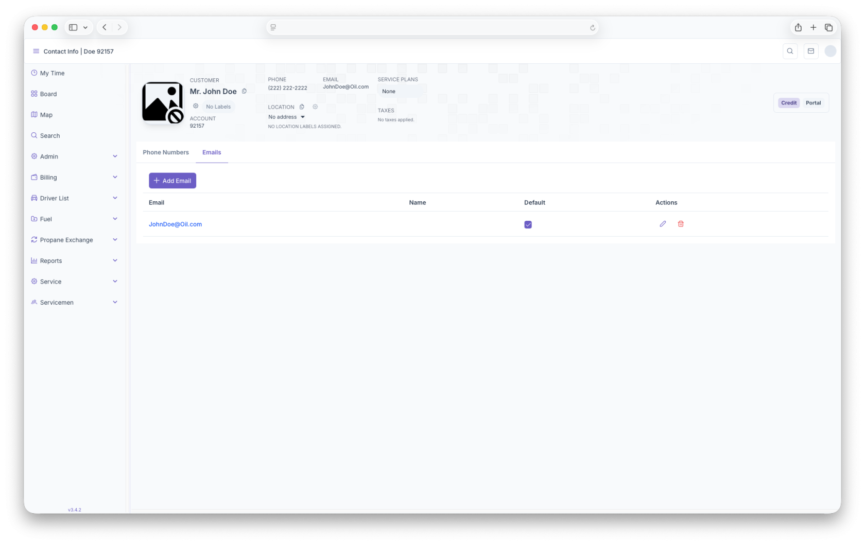 Here, the customers main email will be displayed. Clicking on the email allows for adding, editing or deleting emails. The page generates in rows that includes the email, name, default and actions.