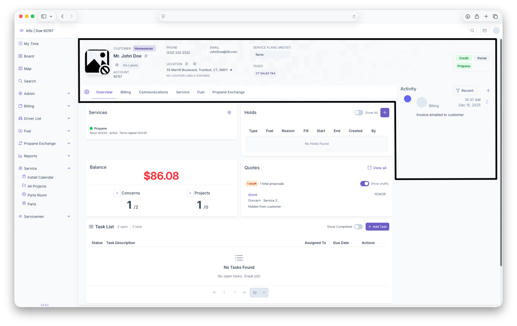 Upon landing on the customer account page, the Customers basic information will be displayed on the top of the page. This includes the customers Profile Picture, Customers Name, their Account Number, Phone Number, Email, Service Plans, Location, and Taxes. The customers basic information can be edited by clicking on the gear button right below the the customers Profile Picture. The right side of the screen will also show the status of the customers account. Below that will be the communications board. The customers account can alse be edited on this page as well.