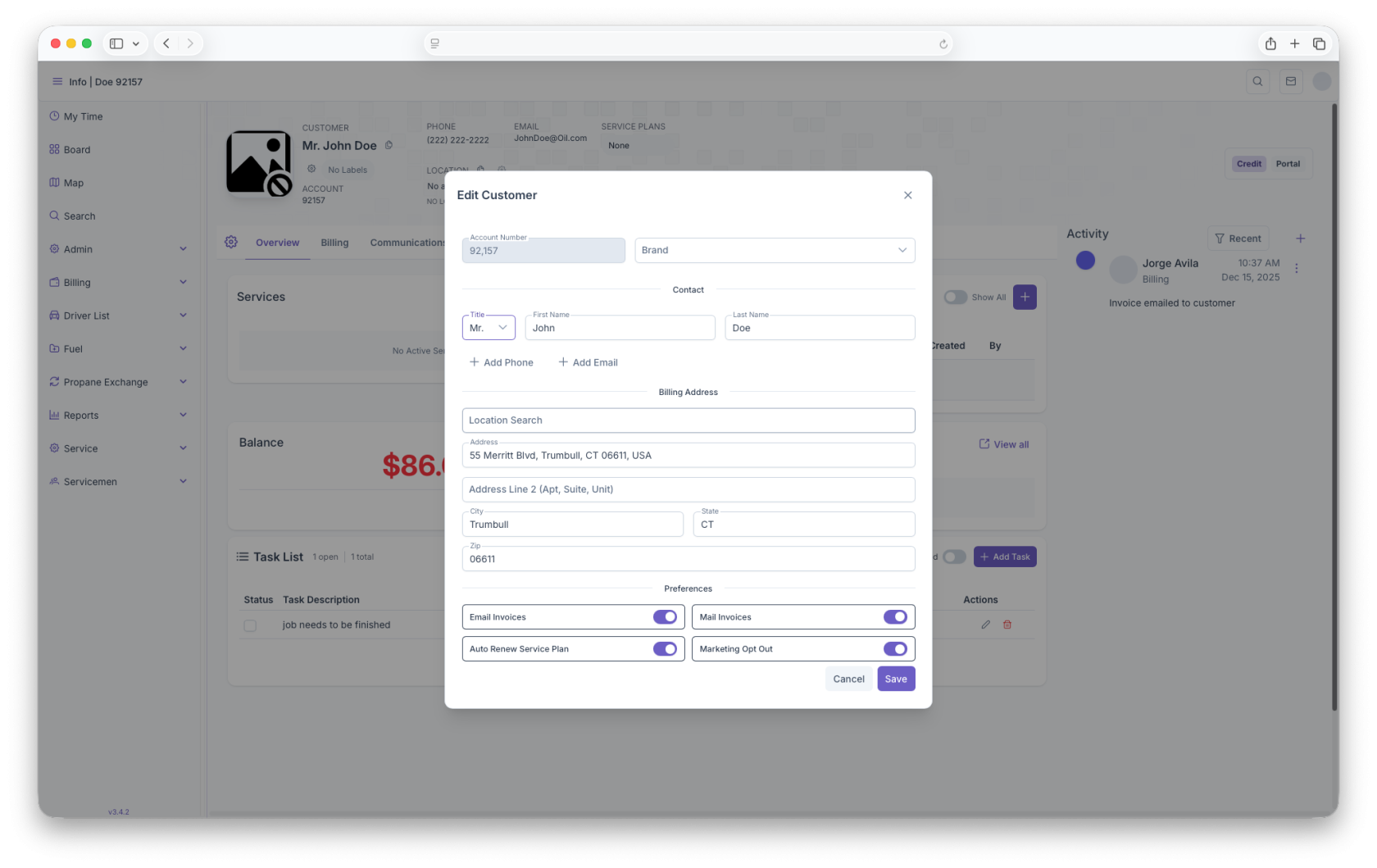 - Preferences - Here the customers preferences can be set, whether they want their invoices to be emailed or mailed to them, if they want to Auto Renew their Serviece Plan and if they want to opt in or out of any Marketing.