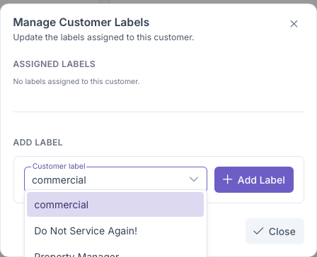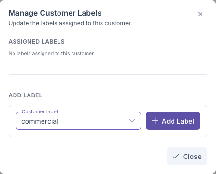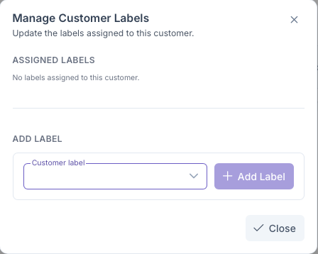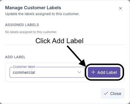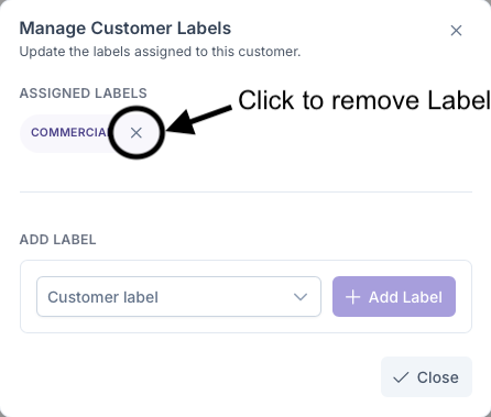 Once added, the label will show up under assigned label on the Manage Customer Labels as well as under the customers name. Clicking on the X next to the label in the Manage Customer Labels will remove the label from the customers account.