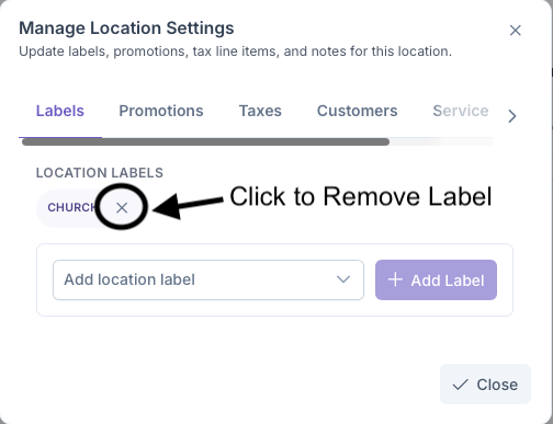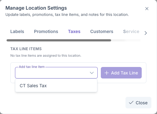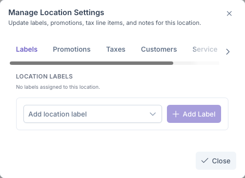 After a location has been created, settings on the location can be edited which include, Labels, Promotions, Taxes, Customers, Service Zones, Notes and Address. If a Customer has more than one location on their account, these location settings must be adjusted for all locations as each location essentially serves as another account under the customer. With the exception of Customers, Notes and Address, the other settings are based on settings set by the company on the Settings chapter.