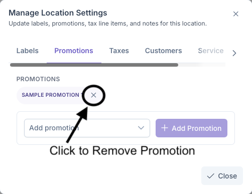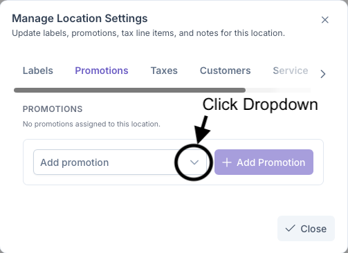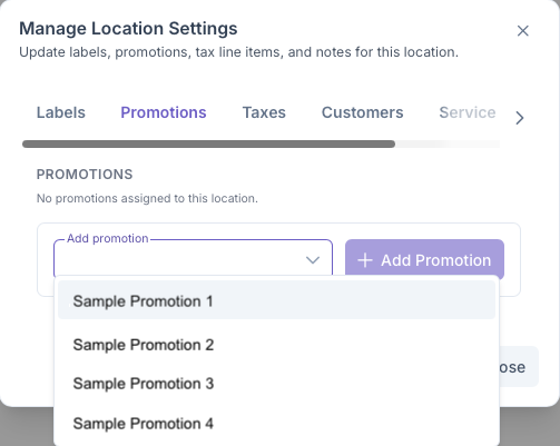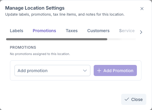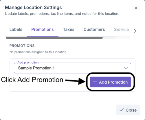 Clicking on the Promotions tab will bring up the Add Promotions sections. Here Promotions can be assigned to the customers locations, such as discounts for being a first time user or being an suto pay customer. These settings are pre set in the Promotions sections under Admin, A more indepth look into how to set Promotions can be seen on the Promotions page.