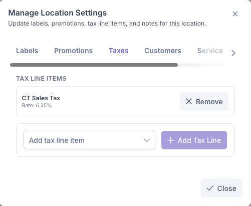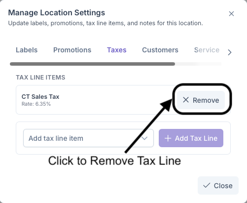 Once all set or if the Tax Line was already added, Taxes will then be added to all services selected to be taxed for the Customer. Taxes can be deleted by clicking on the X next to the Tax Line