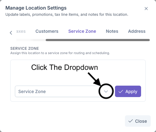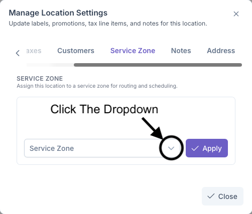 - Click on the Service Zone Dropdown