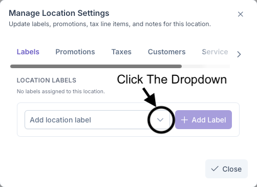 - Click on the Add Location Label Dropdown to bring up a list of pre set labels