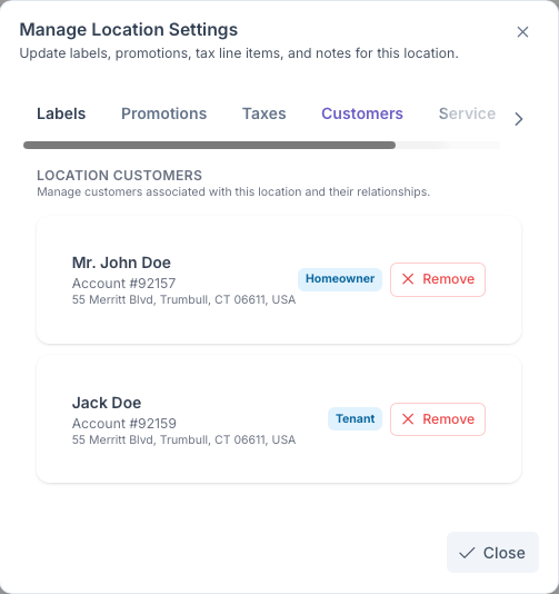 Clicking on the Customers tab will bring up the customers sections. This section here shows all customers associated with this address. A more in depth look at how customers can be linked to the same address can be seen on the Location Management page. Customers can also be removed from an address here by clicking on remove next to the customer that is going to be removed.
