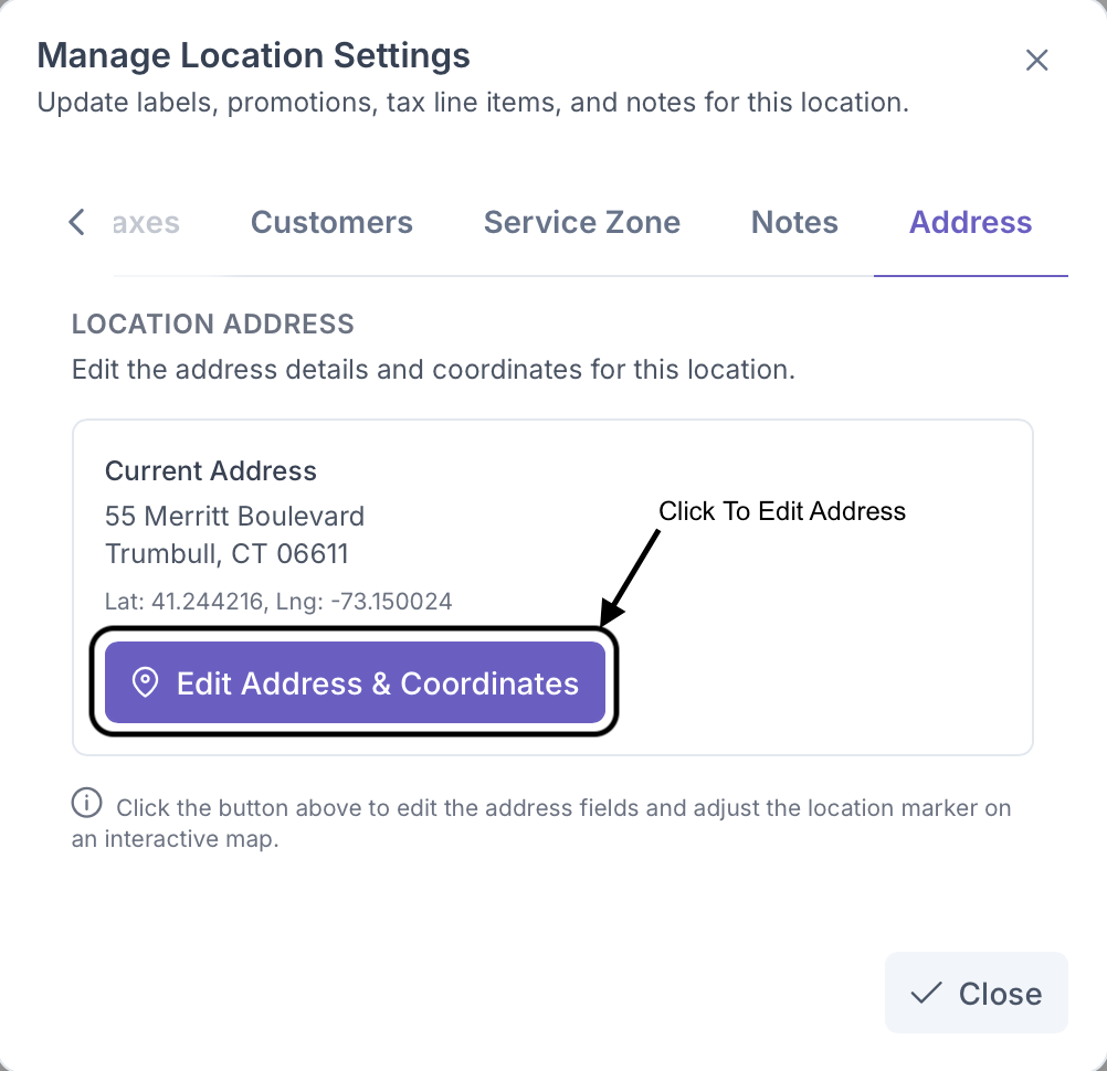 Clicking on the Address tab will bring up the Address section of the Locations seetings. Here the address and coordinates of the customer will appear. The address can also be edited here in the event of the customer moving