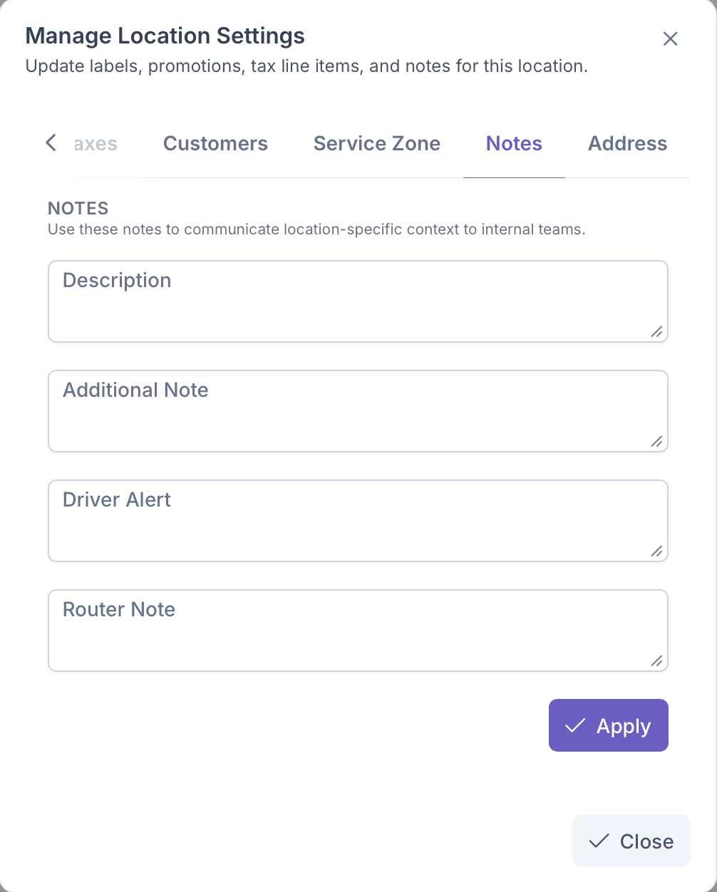 - Router Note - Notes that the router should know before the location is routed for delivery