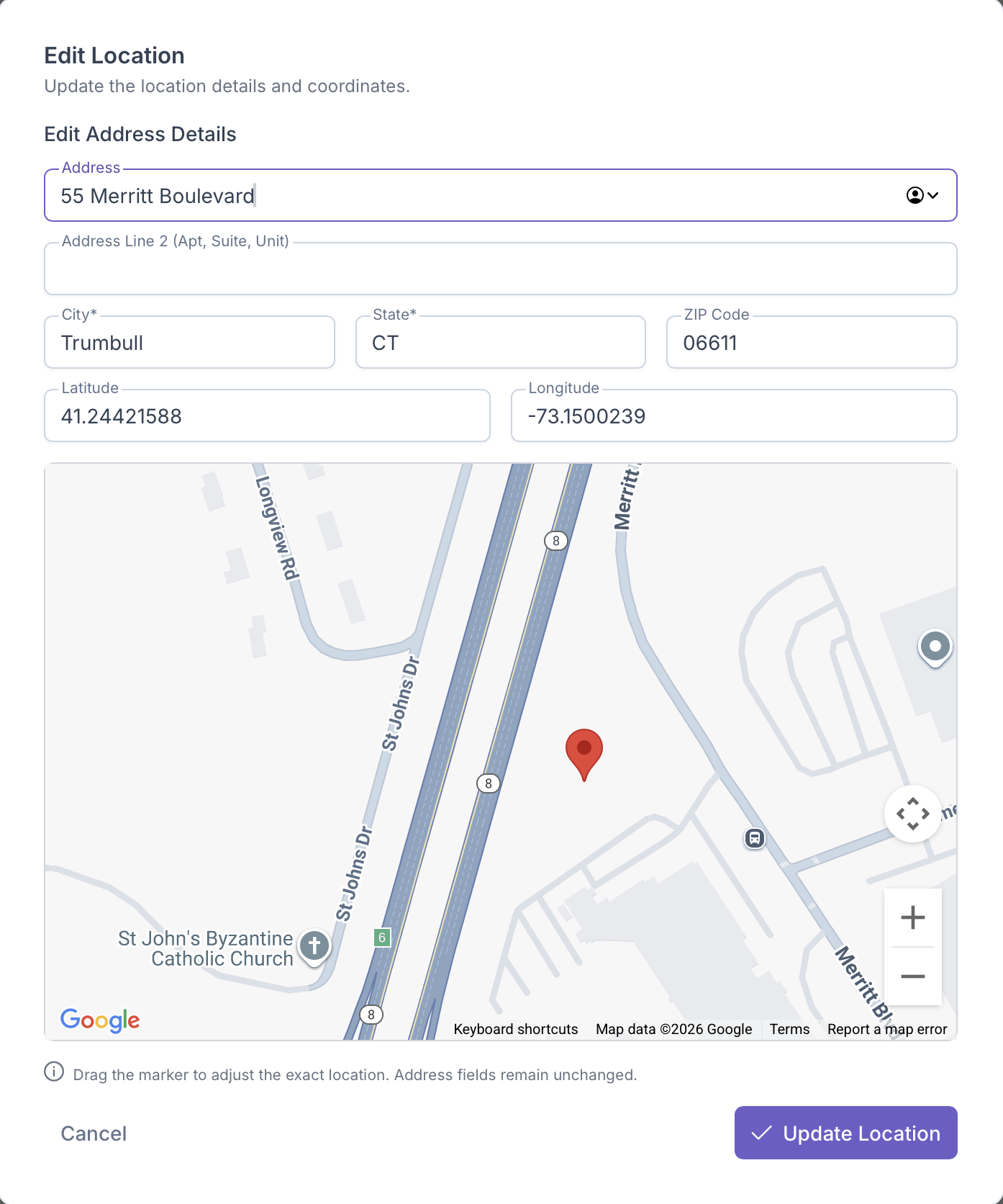 - The Lattitude and Longitude can only be edited by dragging the marker on the map itself