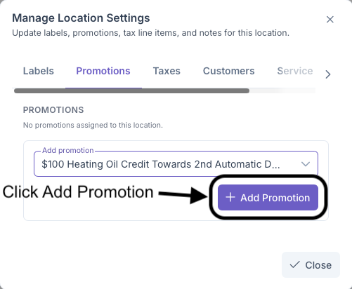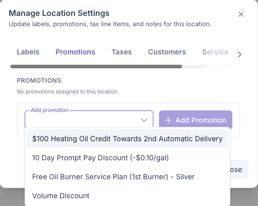 Clicking on the Promotions tab will bring up the Add Promotions sections. Here Promotions can be assigned to the customers locations, such as discounts for being a first time user or being an suto pay customer. These settings are pre set in the Promotions sections under Admin, A more indepth look into how to set Promotions can be seen on the Promotions page. To set a Promotion