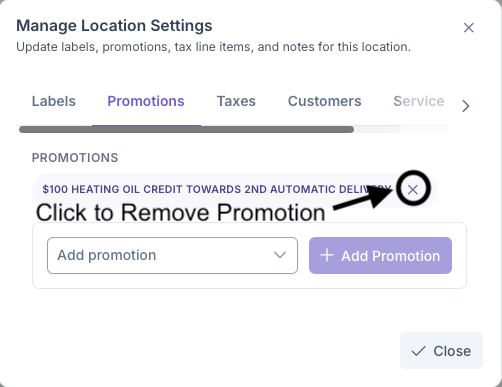 Once added, a promotion will now be applied to the customers account if they meet the criteria set when the promotion was created by the company. A promotion can deleted from the account by clicking on the X next to the promotion
