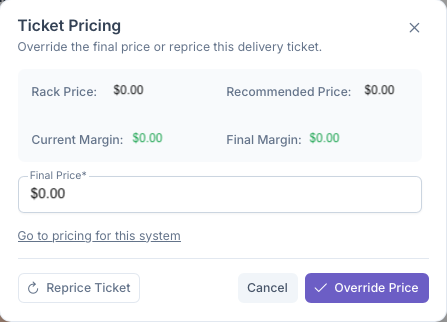 Once finished, clicking on Override Price will add the new final price for the customers delivery if applicable. If a last minute change was made, on the customers account such as an added promotion, clicking on Reprice Ticket will reprice the ticket with the added promotion.