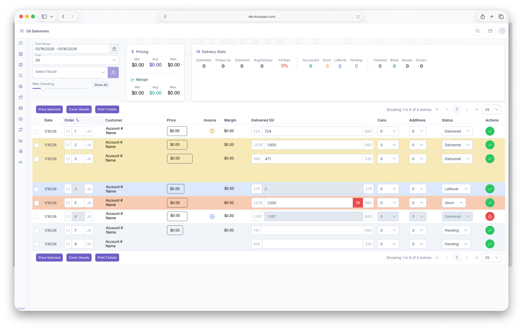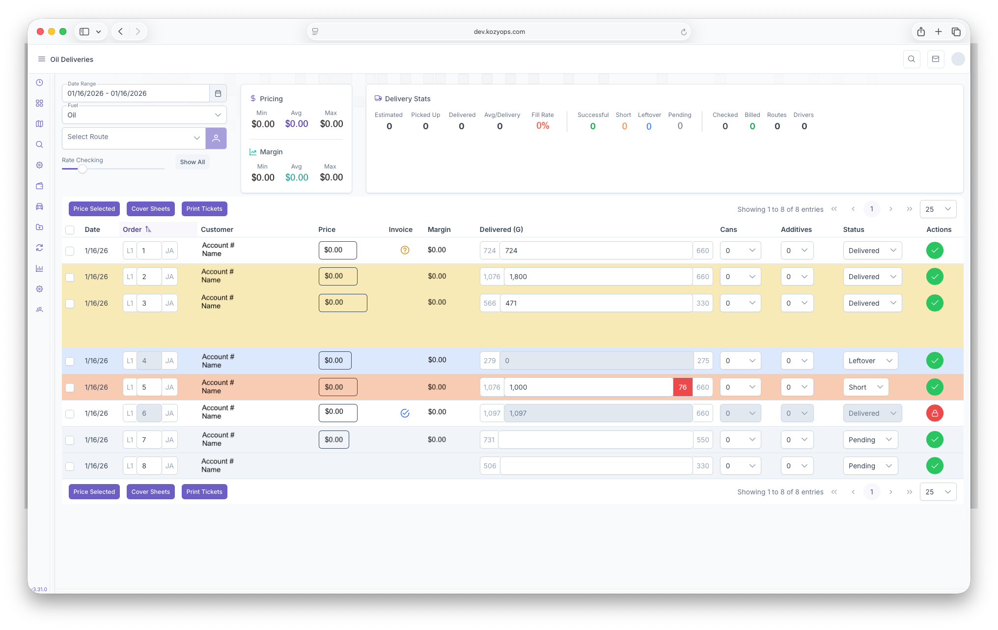 - Delivered - Delivery was successfully completed - Will appear as blank if expected amount was delivered and Yellow if delivered amount is over or under the expected amount