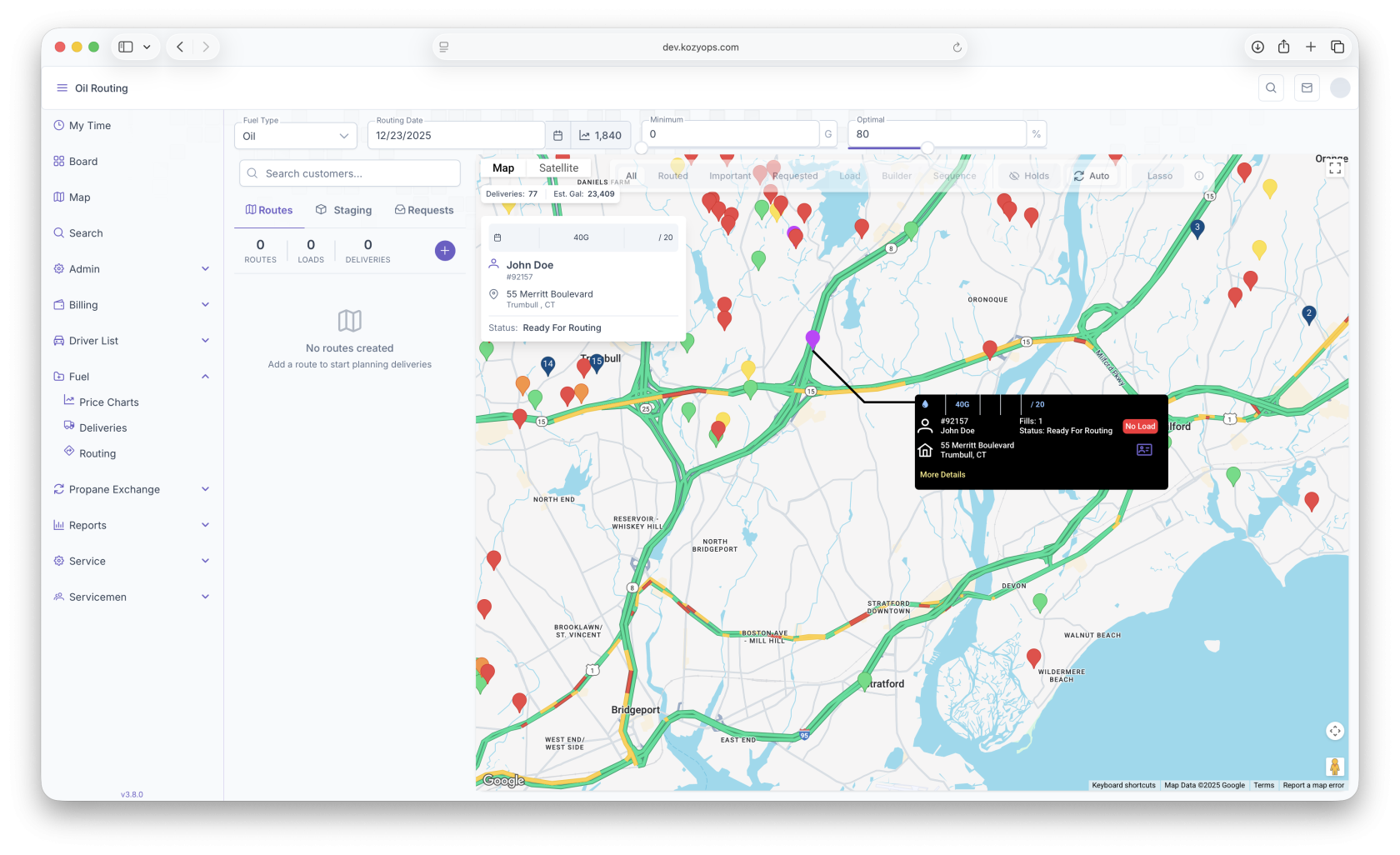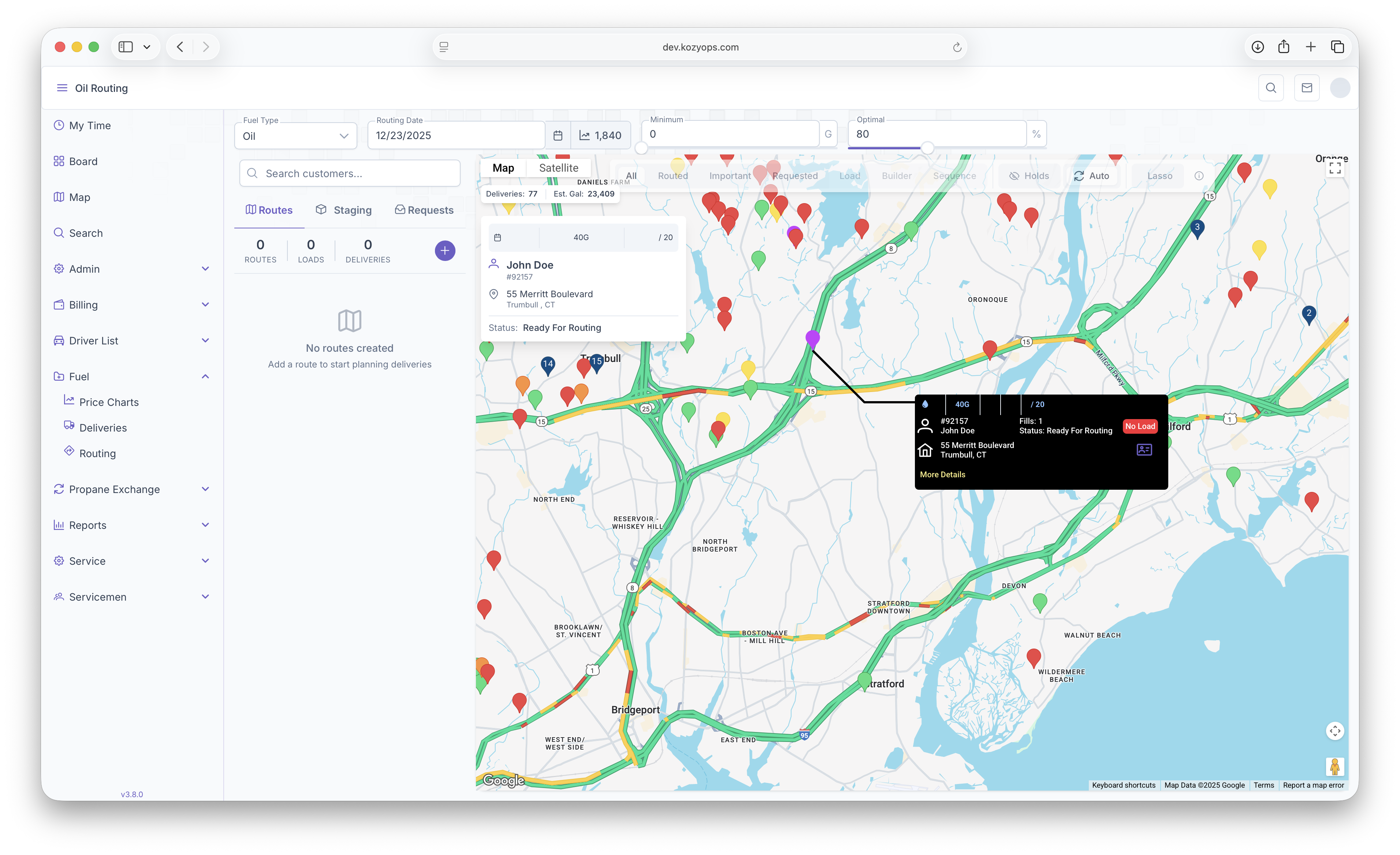 These will be the first steps taken in order to start a route. The map will also show the current degree day next to the Routing Date. Once completed, The Routing Map will open up showing all Customers on the map.