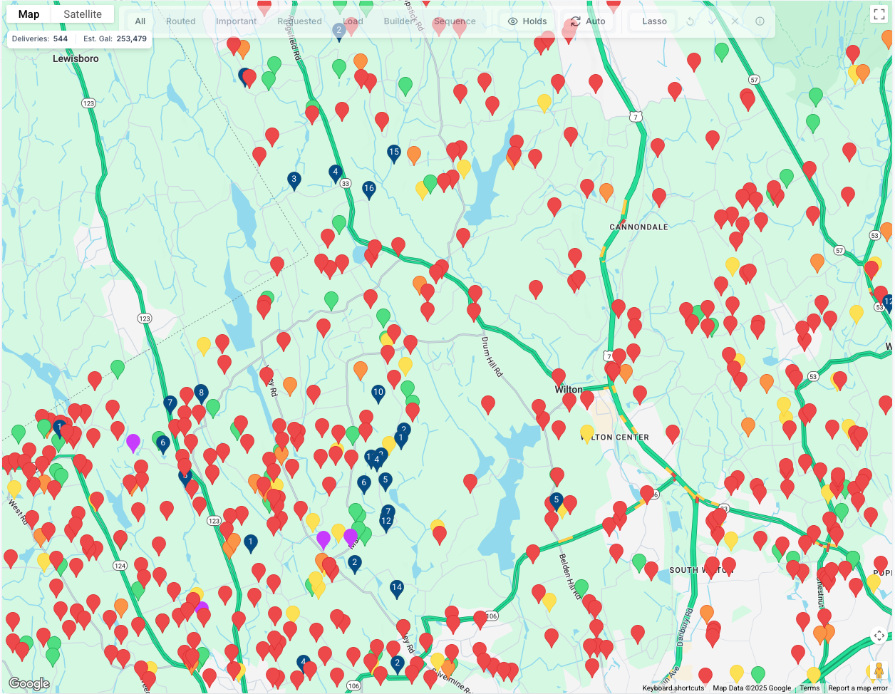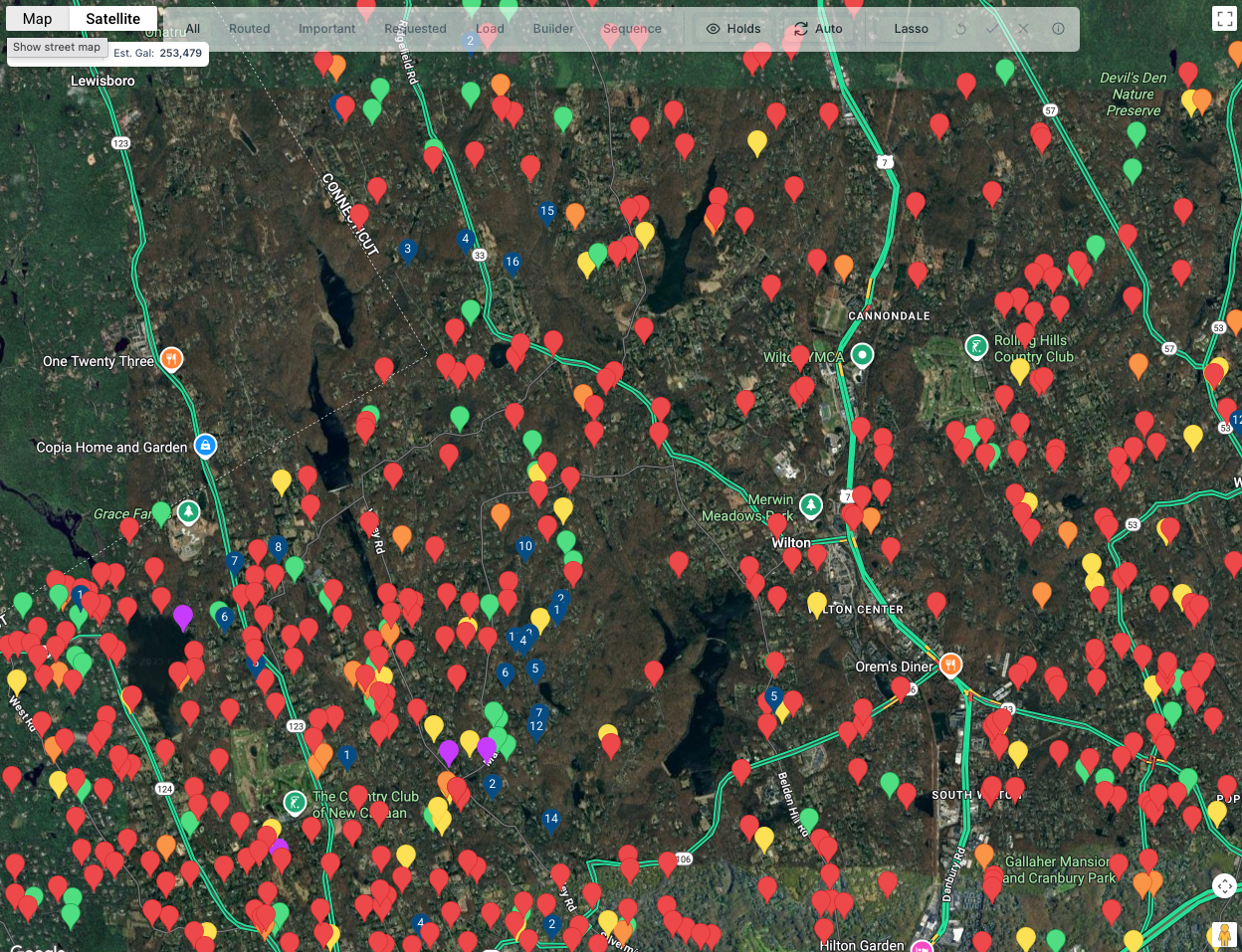 Below the Map and Satellite bar, is another bar that shows total number of potential deliveries on the map as well as total number of estimated gallons for the day.