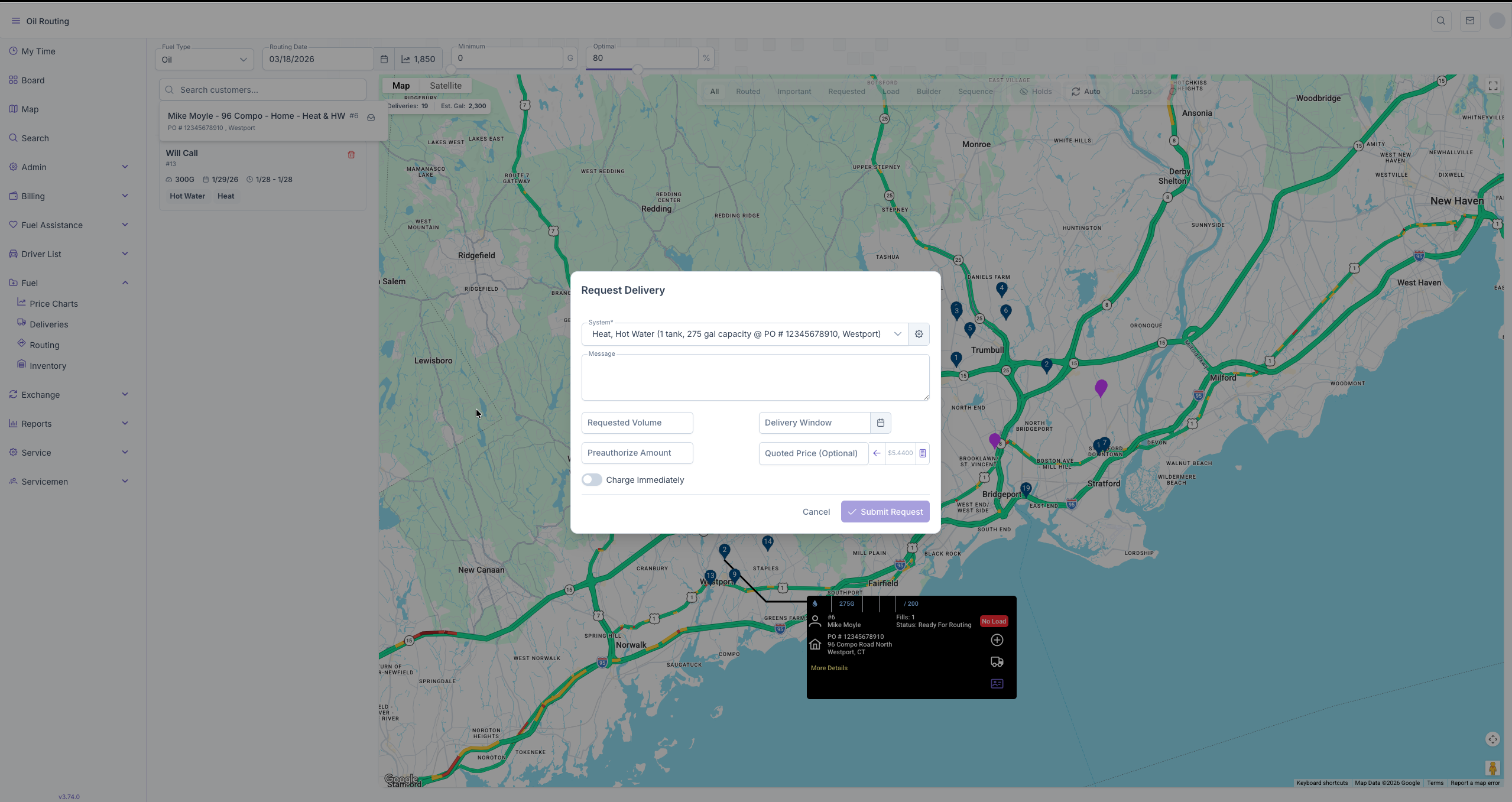 2. Select the correct System, enter Requested Volume and delivery window requested date. Preauthorized Amount and Quoted Price are OPTIONAL. Charge immediately should be turned on if they want their card charged after the delivery is completed.