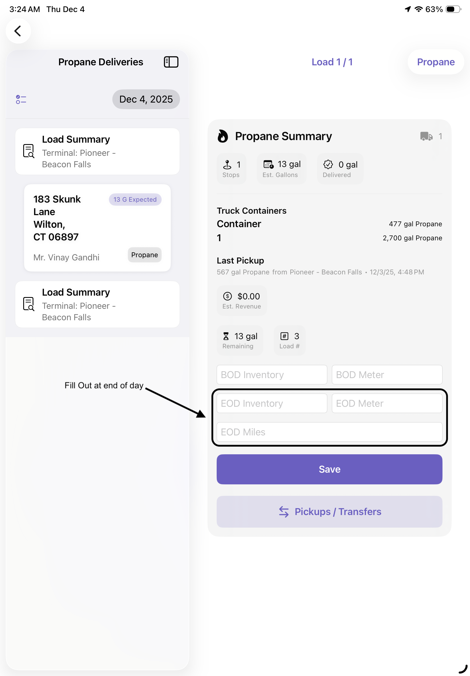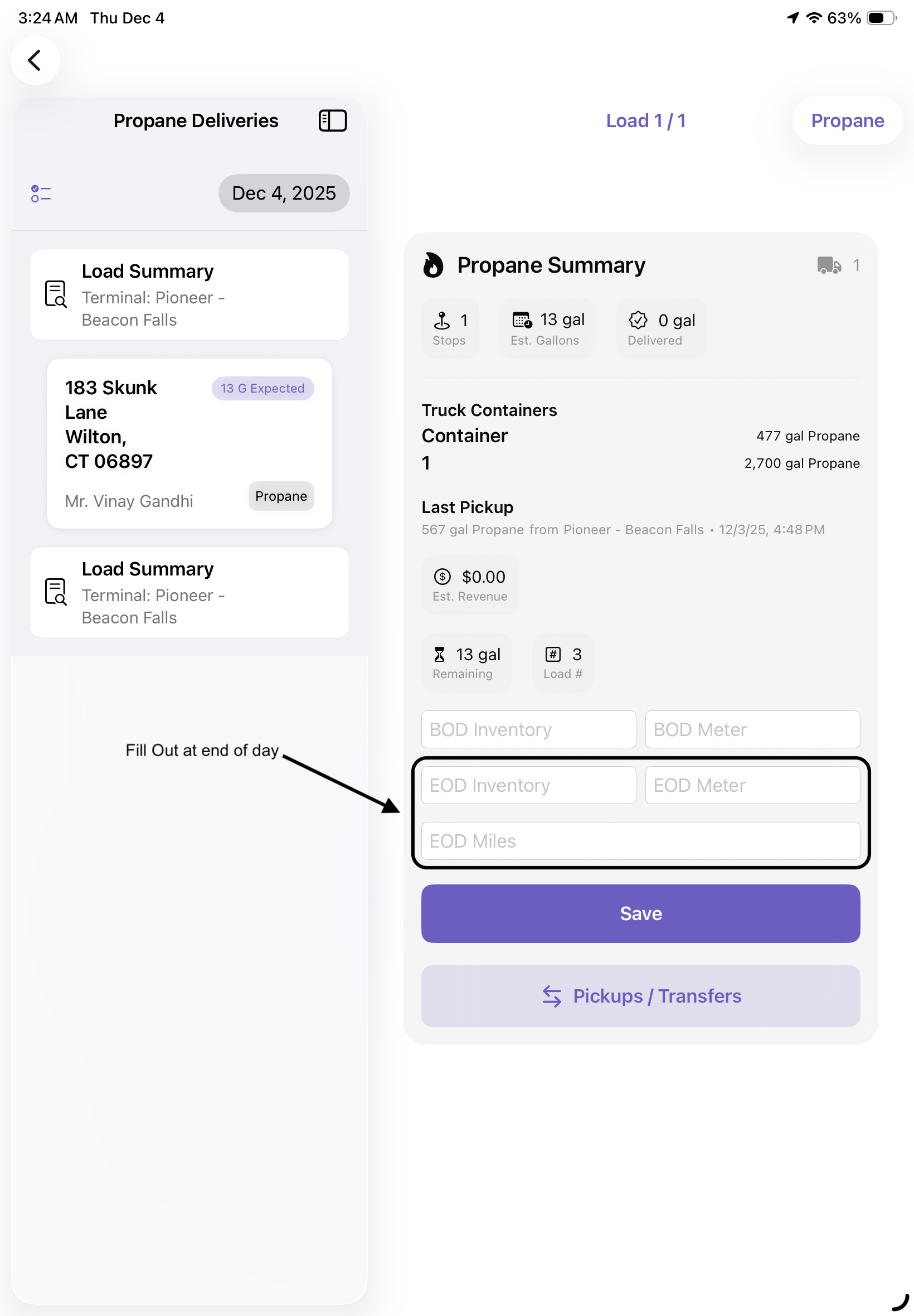2. At the end of the day, update the EOD Inventory, EOD Meter and EOD Miles for both Fuel Types, if applicable