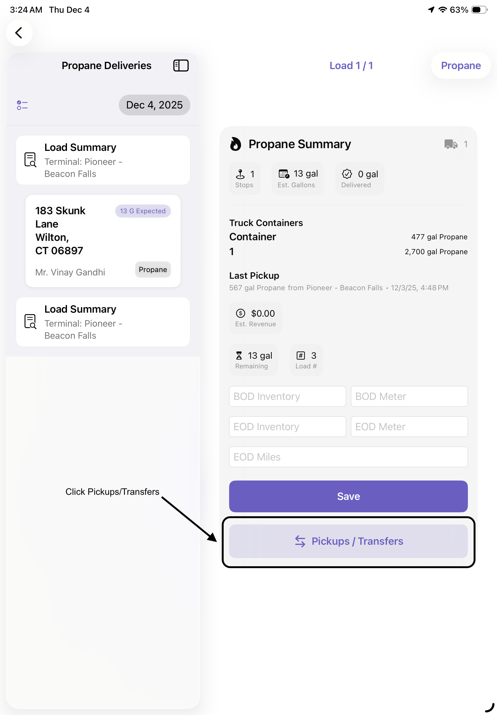 3. After arriving at each terminal tap on Pickups/Transfer then select Source Type (Terminal), Source Container, Destination Type (Vehicle) and Destination Container then record how many gallons you are picking up. Afterwards record your BOD Inventory and BOD Meter to keep track throughout the day. See below for how to Begin a Load