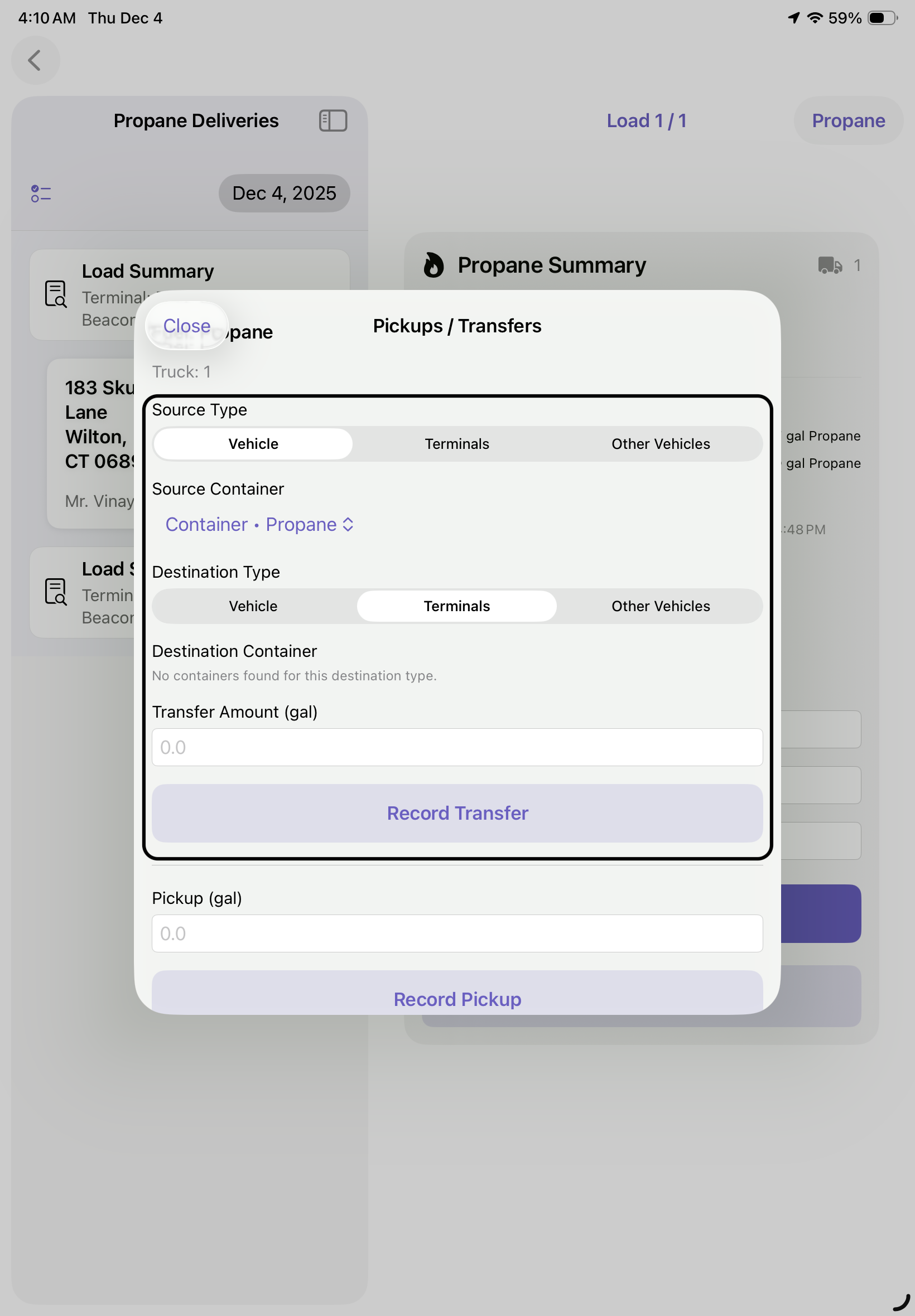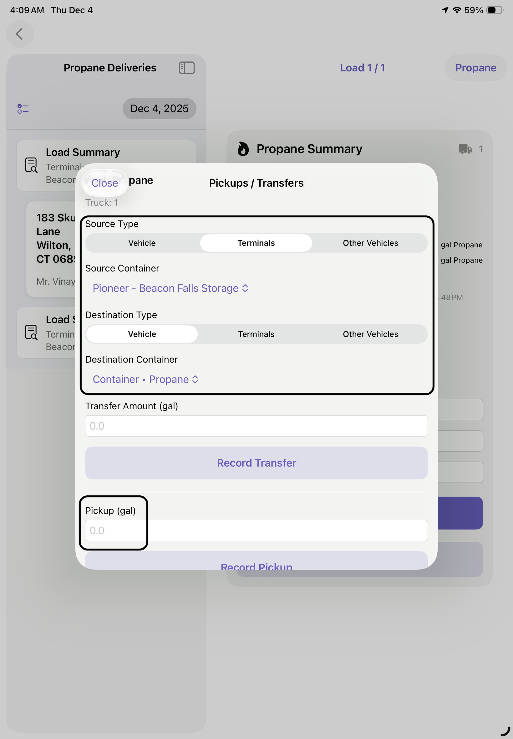 3. Following that, return to each terminal to return any left over fuel, then Tap Pickups/Transfer, select the source the fuel is coming from (Vehicle), The Source Container, The Destination Type (Terminal), The Destination Container and finally, record how many gallons are being transferred. These steps can also be followed if doing a transfer between other vehicles if approved