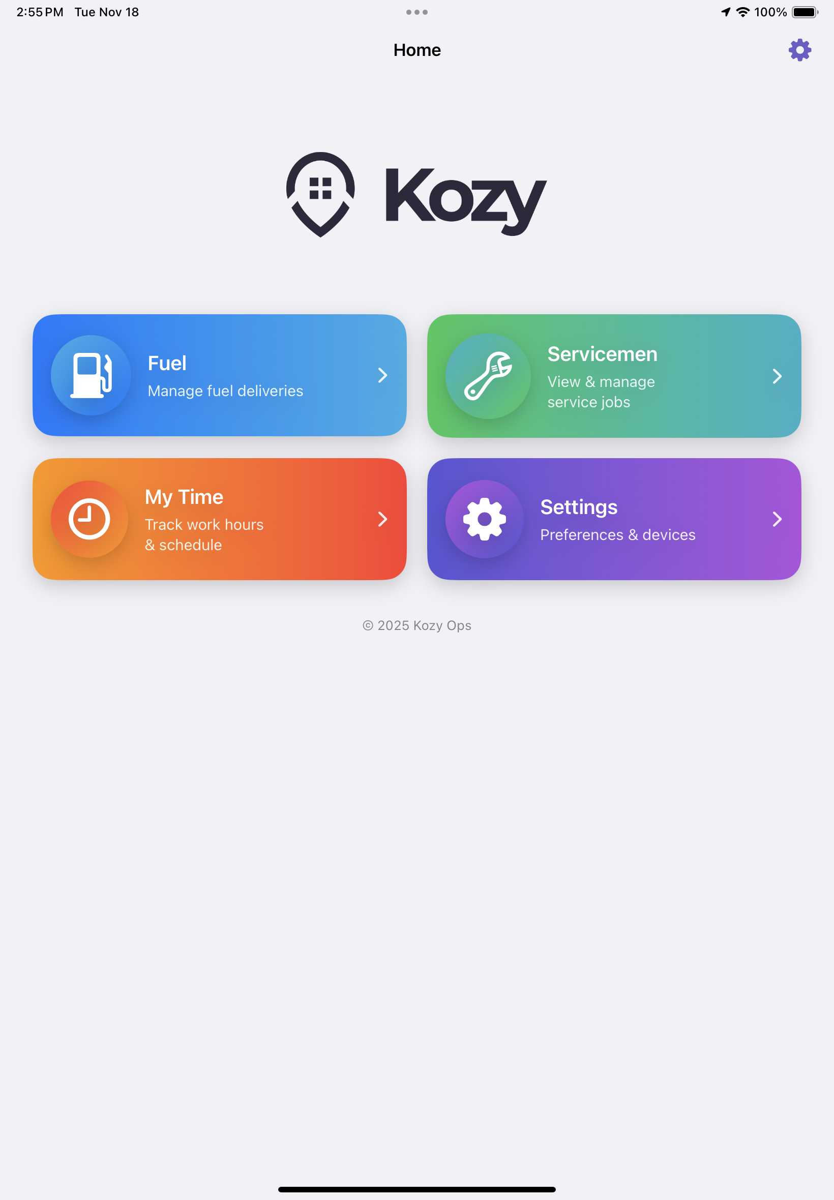 The Home screen is the central hub of the Kozy Serviceman mobile application. It provides quick access to all major work functions through large, easy-to-tap cards. Users can select from Fuel Deliveries, Service Jobs, Time Tracking, and Settings.