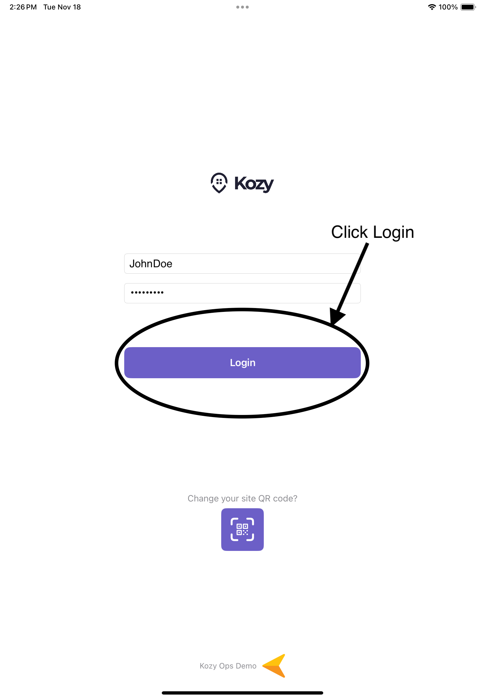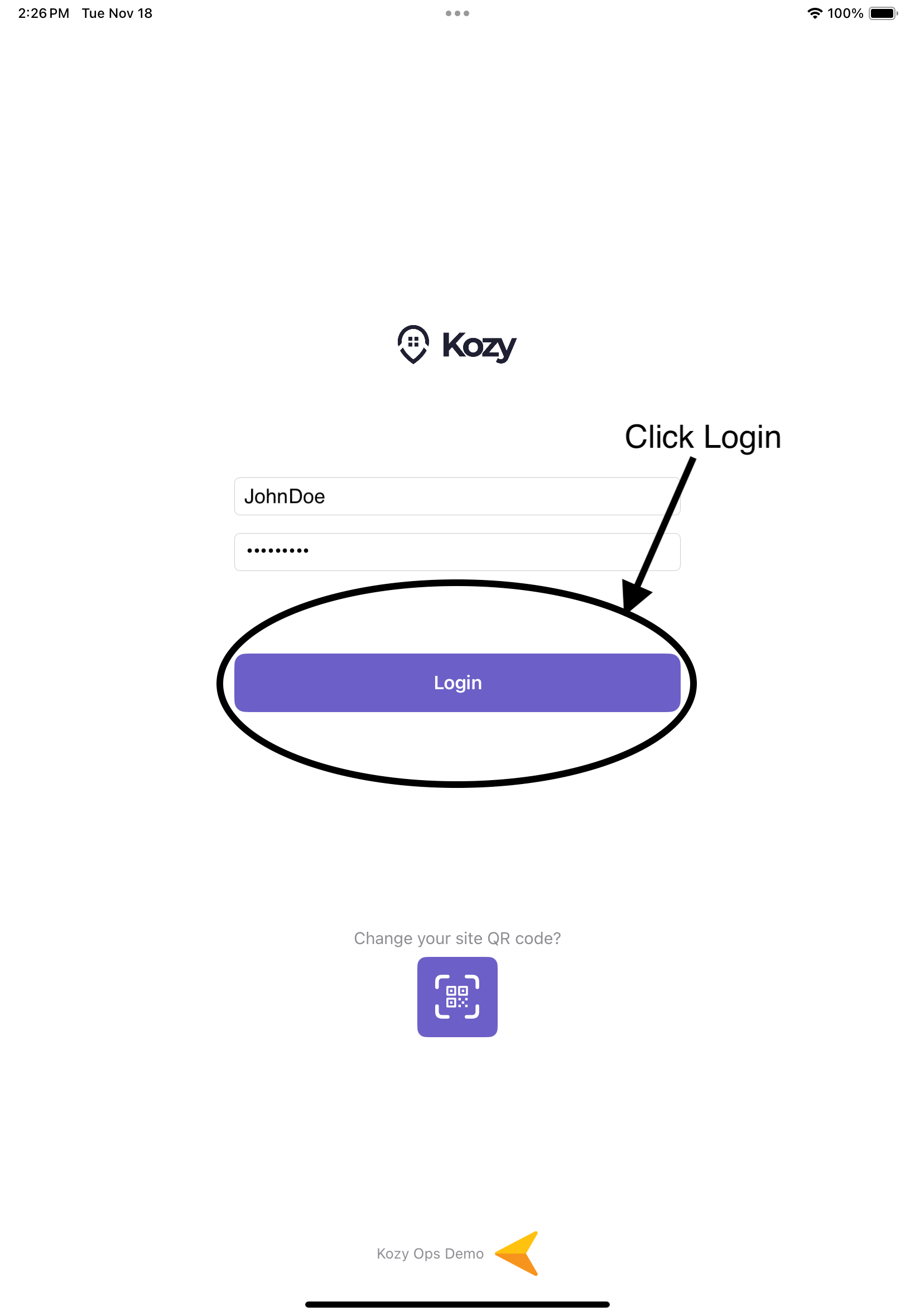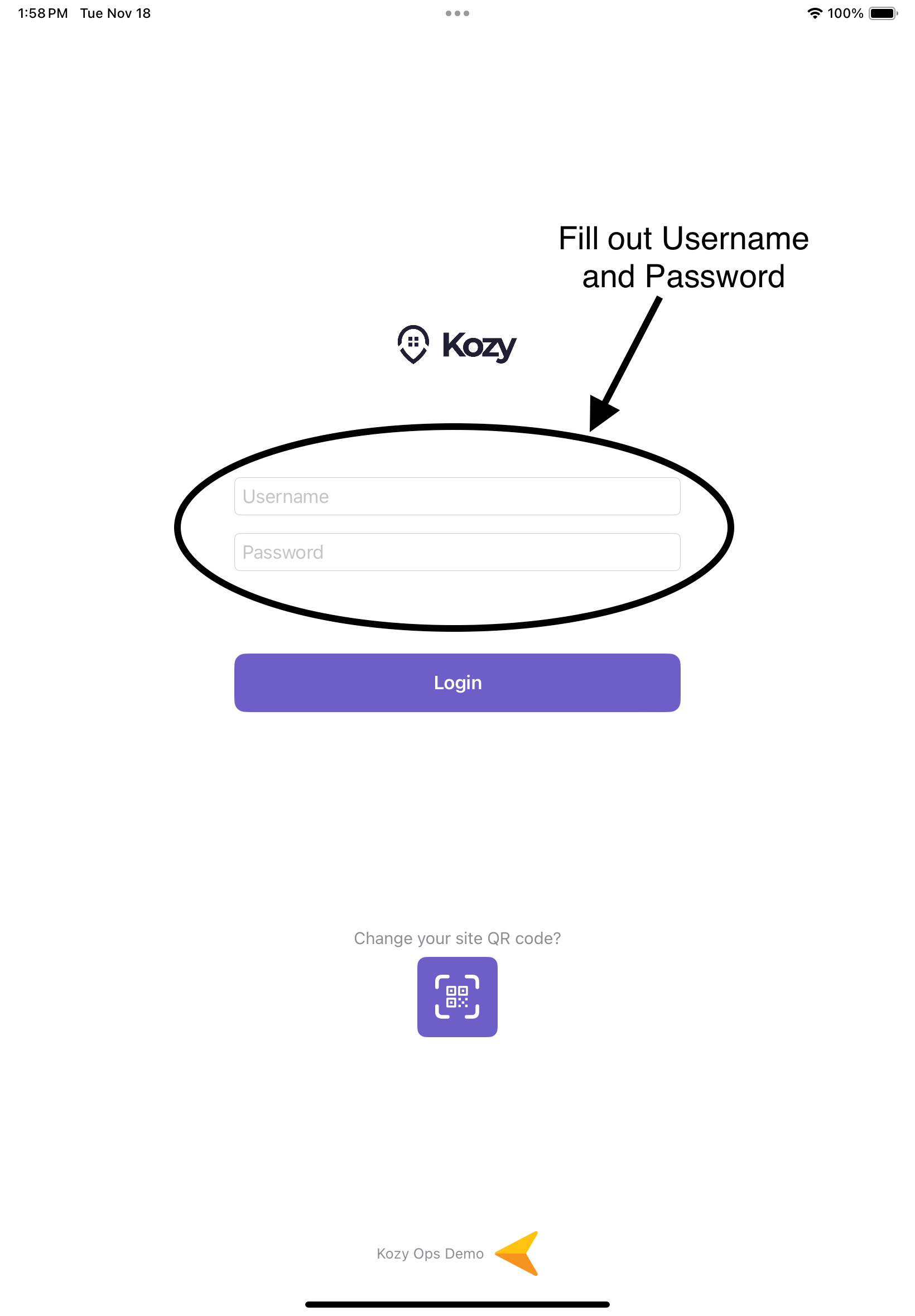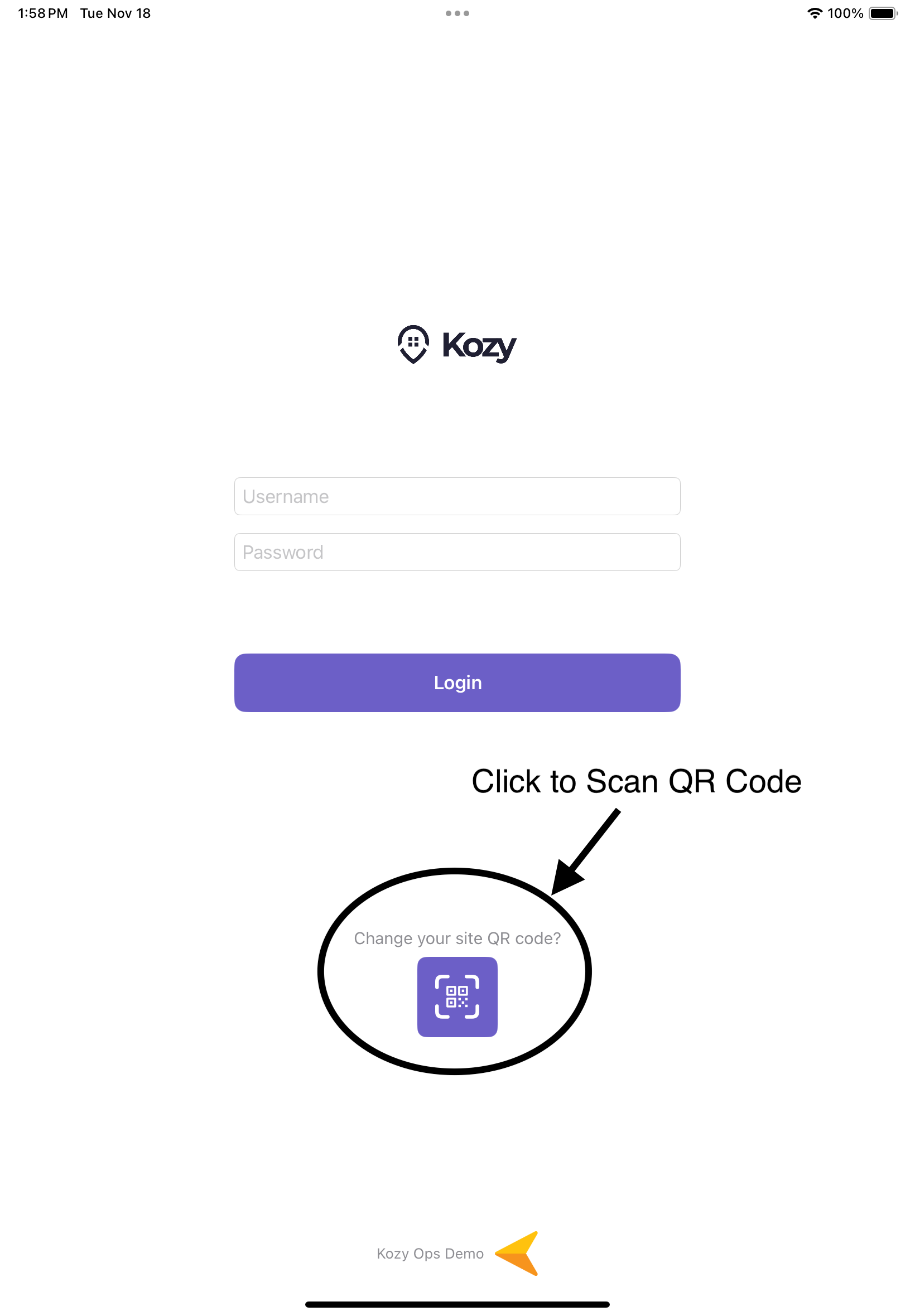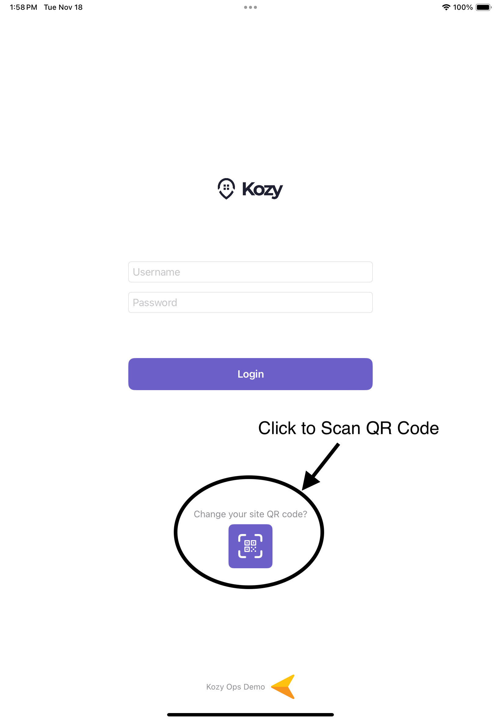 The Login screen is the secure entry point to the Kozy Serviceman mobile application. From here, employees authenticate using their company-issued credentials. First-time users or users switching companies must scan their company’s QR code to connect the app to the correct environment.