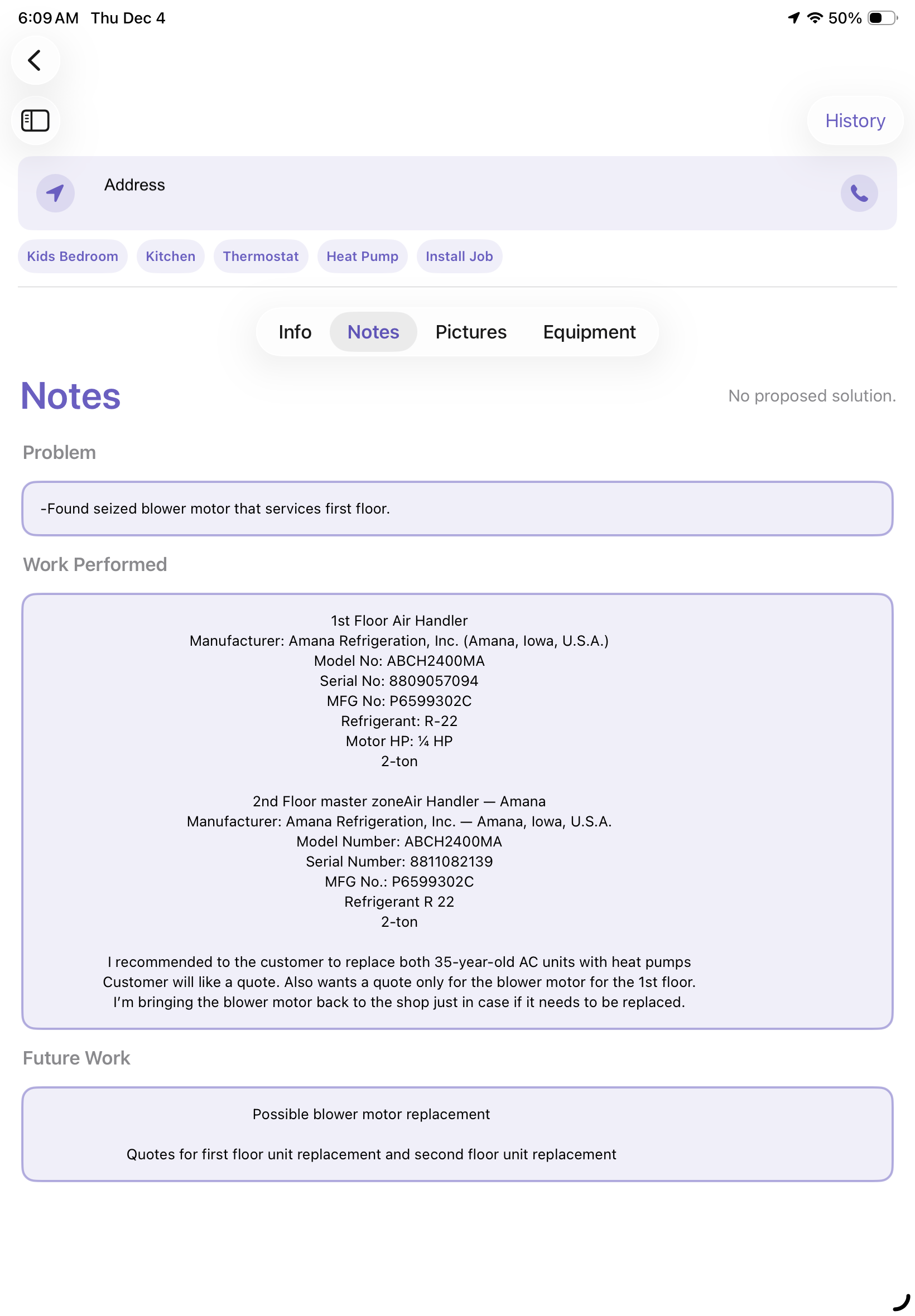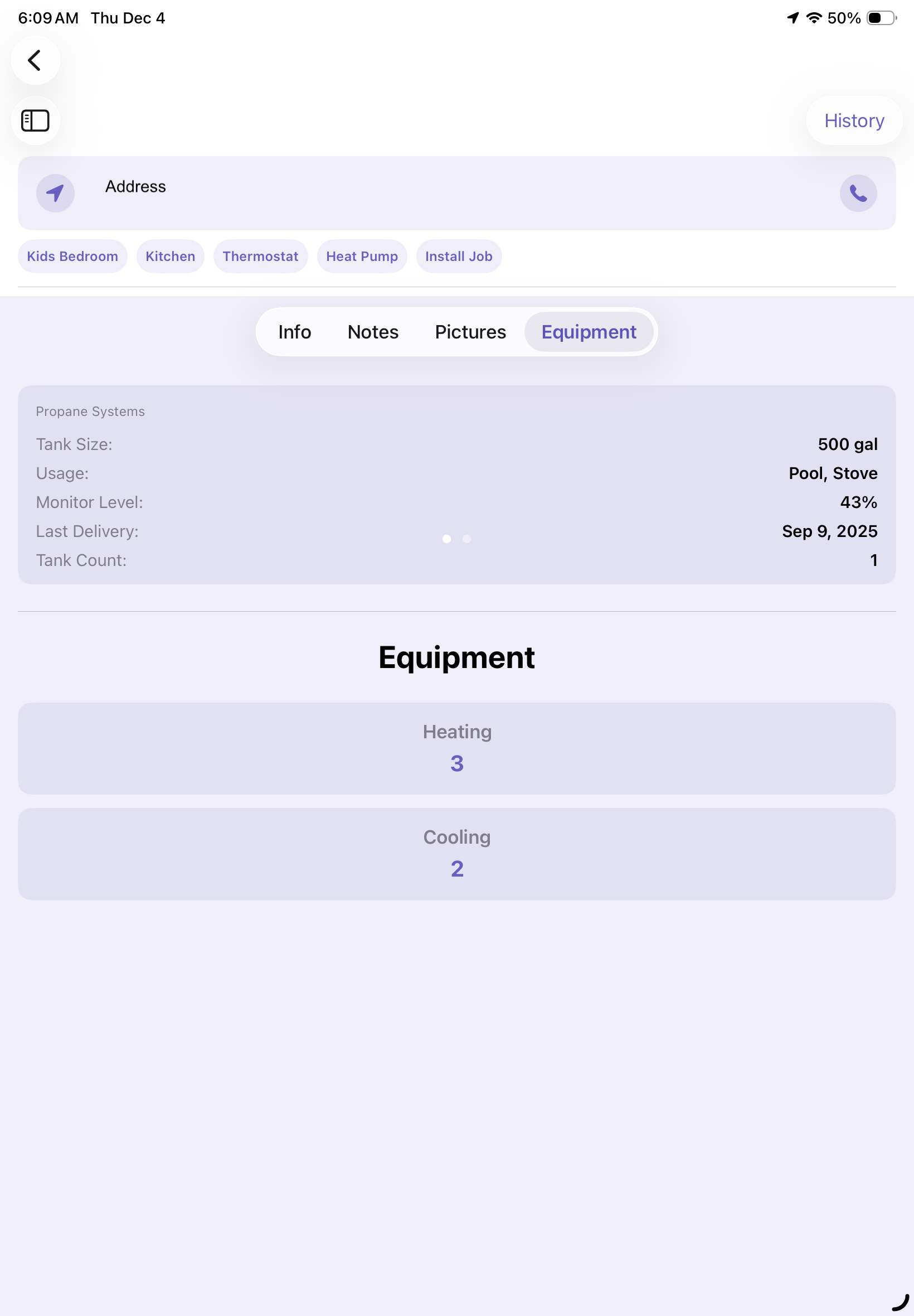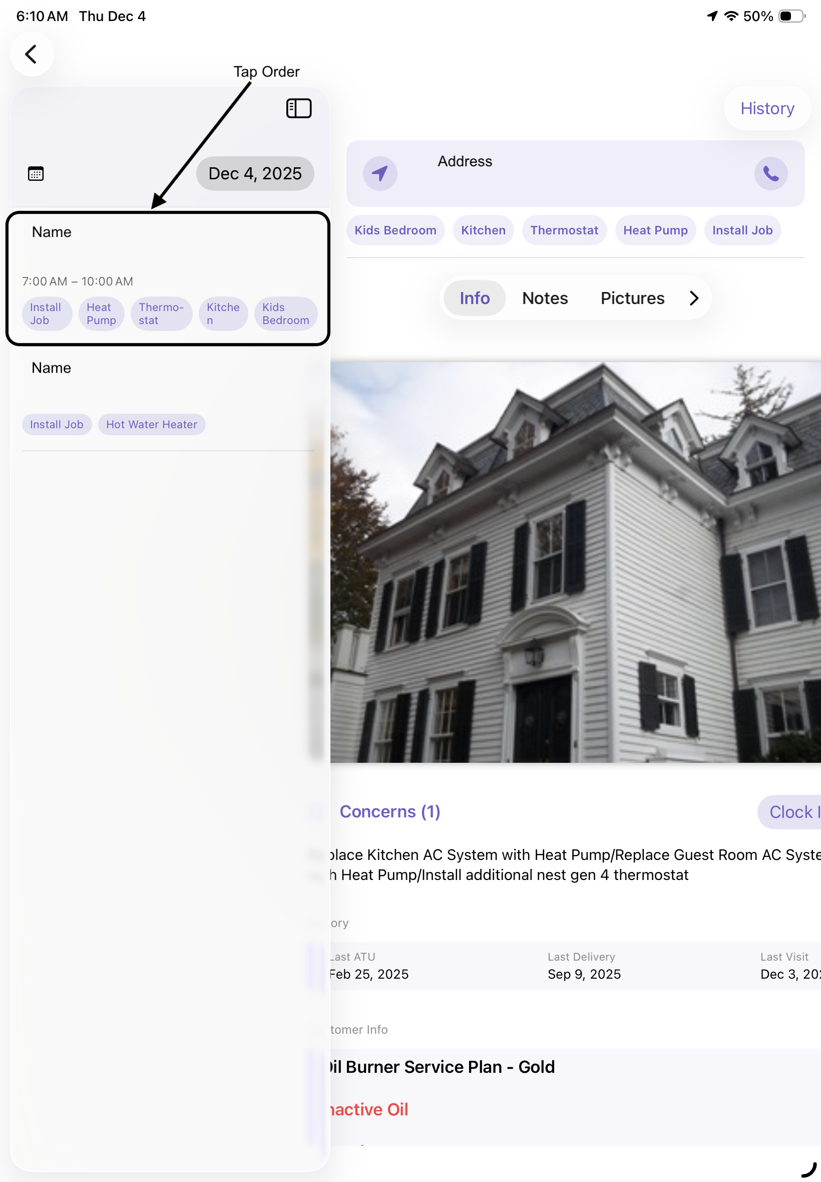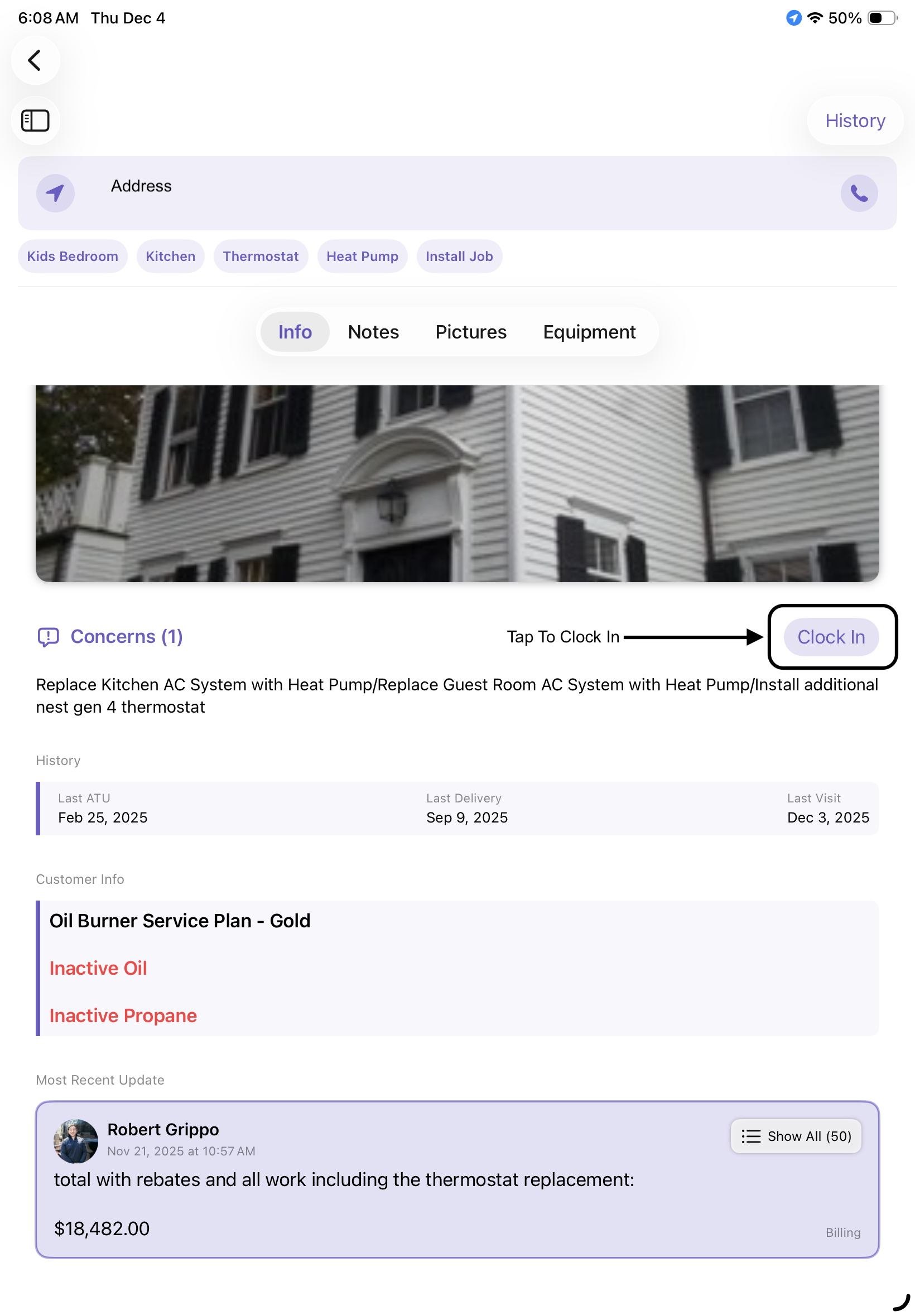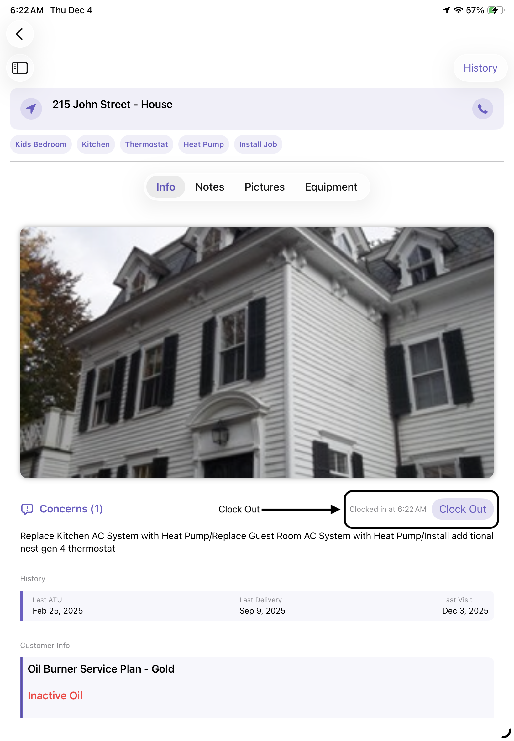 | Info Tab | Shows Customer Address, allows you to clock in, view Customer Concerns, History, Customer info and any updates |