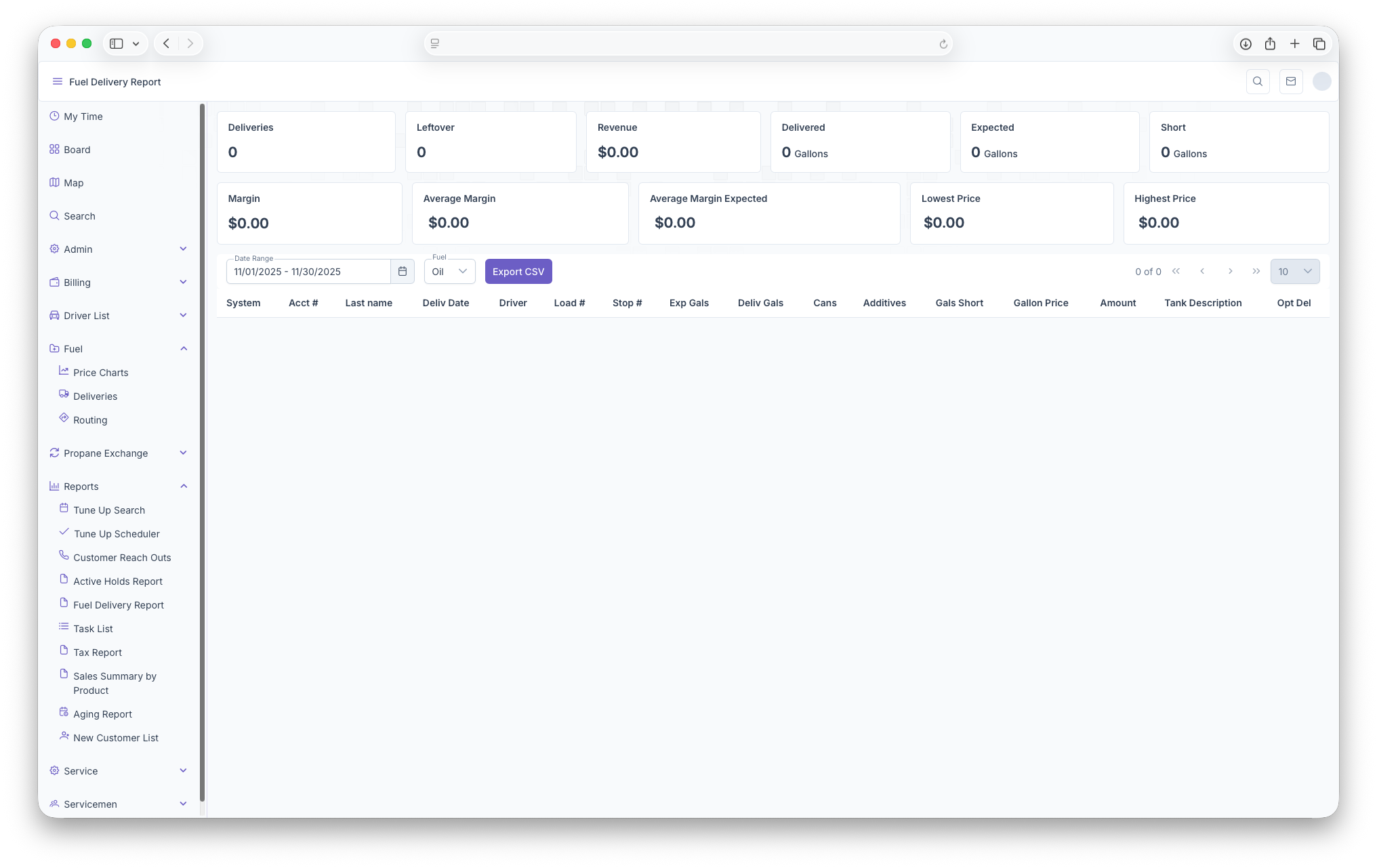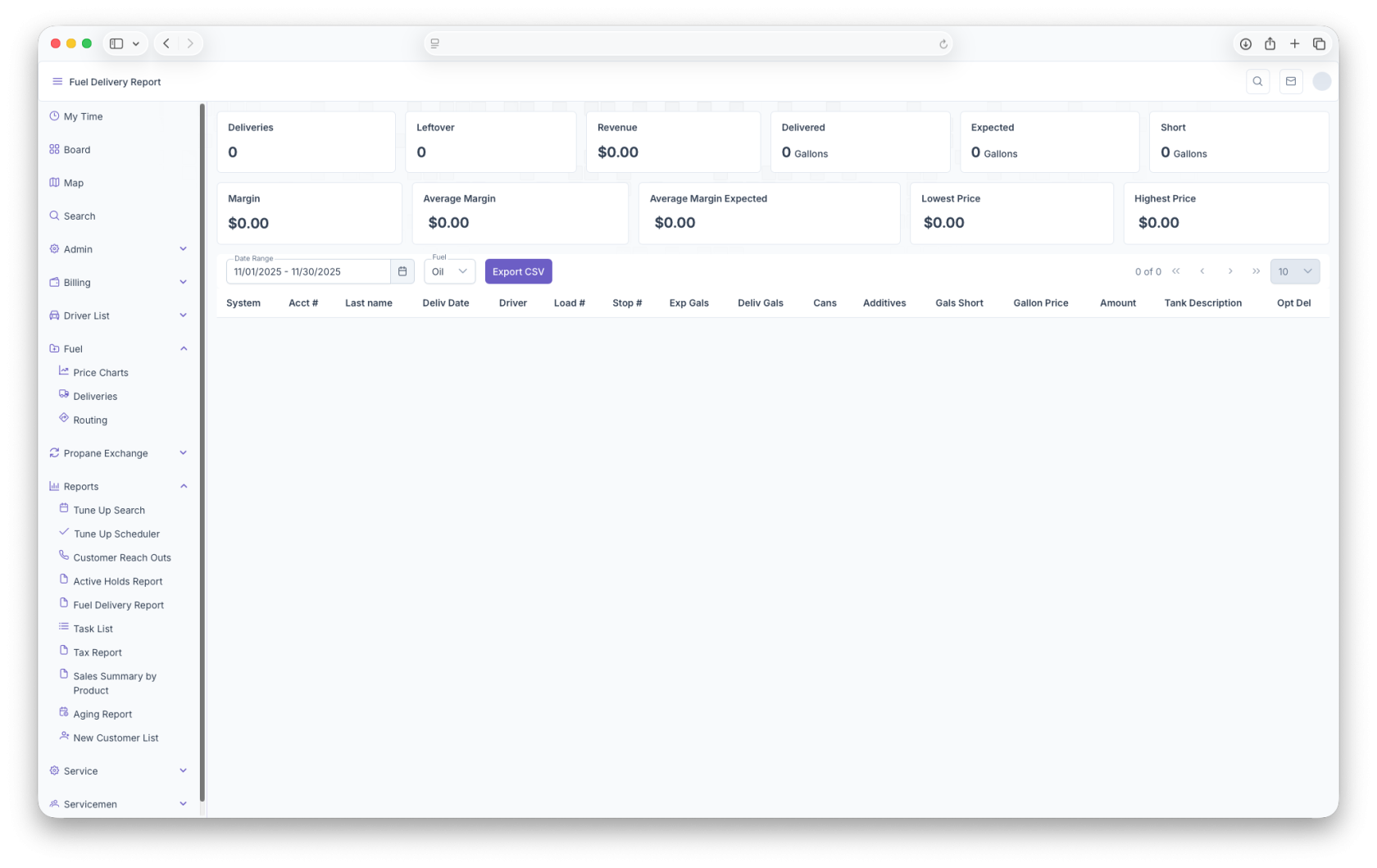 The Fuel Deliveries Report is another way to pull up data on deliveries with the inclusion of total sums based on selected filters. To reach The Fuel Delivery Report, on the side menu, click on reports then click on Fuel Delivery Report. Clicking on the three bars on the top left corner of the page will expand the side menu showing more detail and making it easier to navigate. Once on the page, the page will show a sum of Deliveries, Leftovers, Revenue, how much was Delivered, Expected delivery, how much Shortage, Margin as well as Average Margin, Average Margin Expected, The Lowest Price and The Highest Price. Following that, the page can be filtered by Date Range and type of Fuel. The report is then shown with the following columns, System, Account Number, Last Name, Delivery Date, Driver, Load Number, Stop Number, Expected Gallons, Delivered Gallons, Cans, Additives, Gallon Shortage, Gallon Price, Amount, Tank Description and Optimal Delivery. The report can also be exported into document format for easier printing and sharing by clicking on the Export CSV button next to the filters.