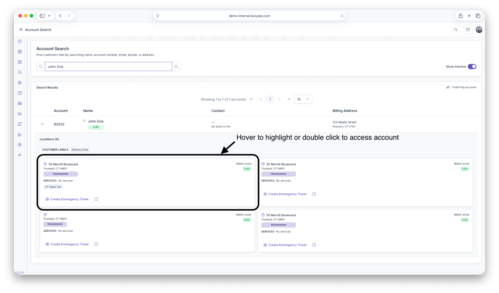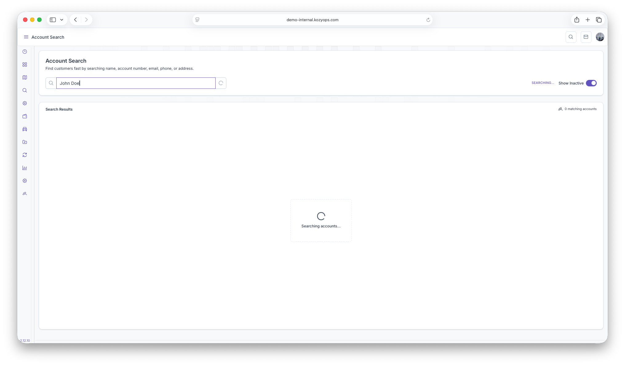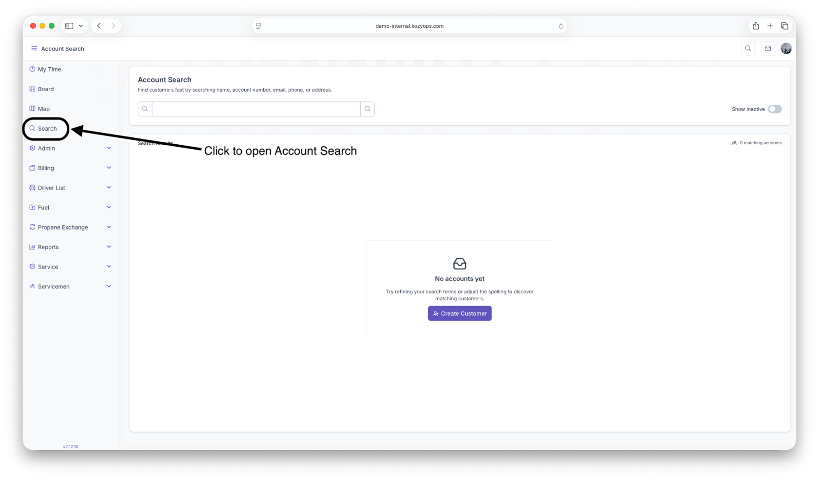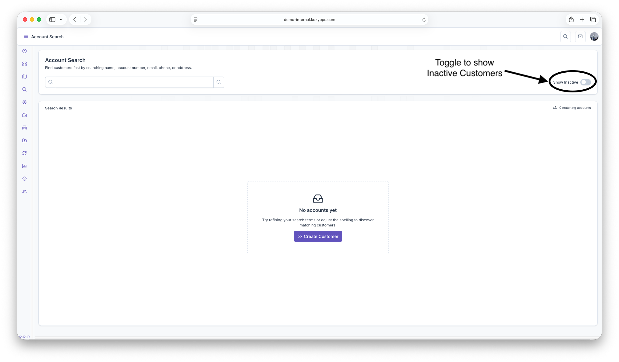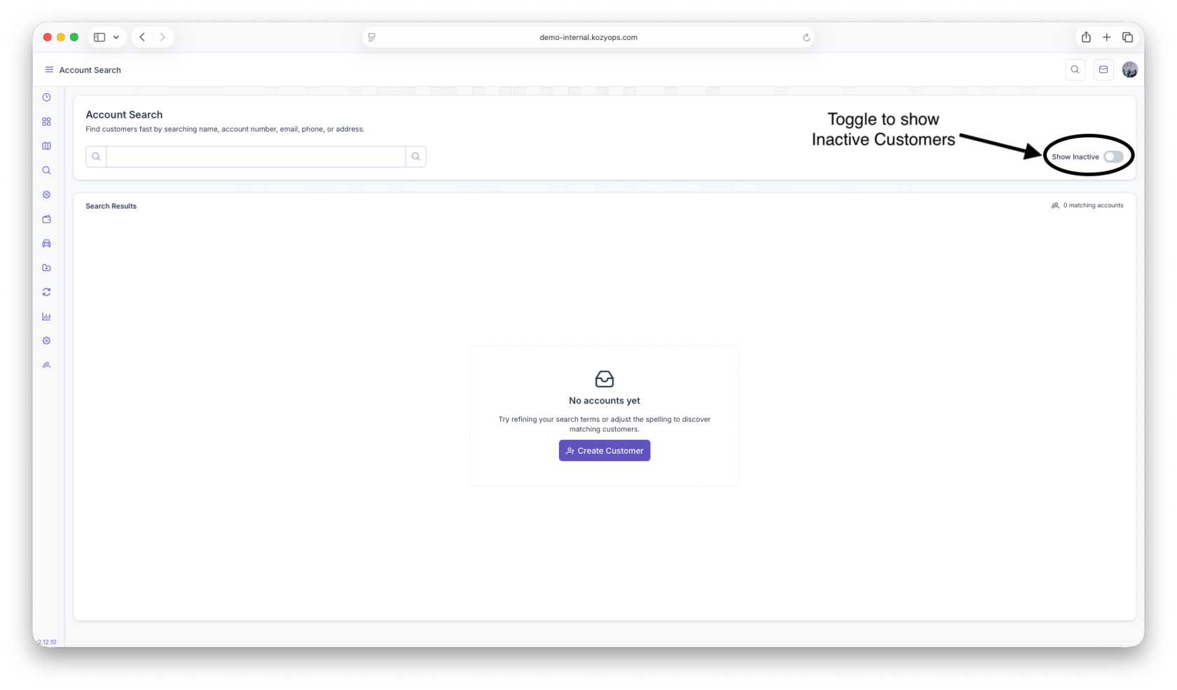 - When no accounts match, the page displays an empty state with quick access to Create Customer.
