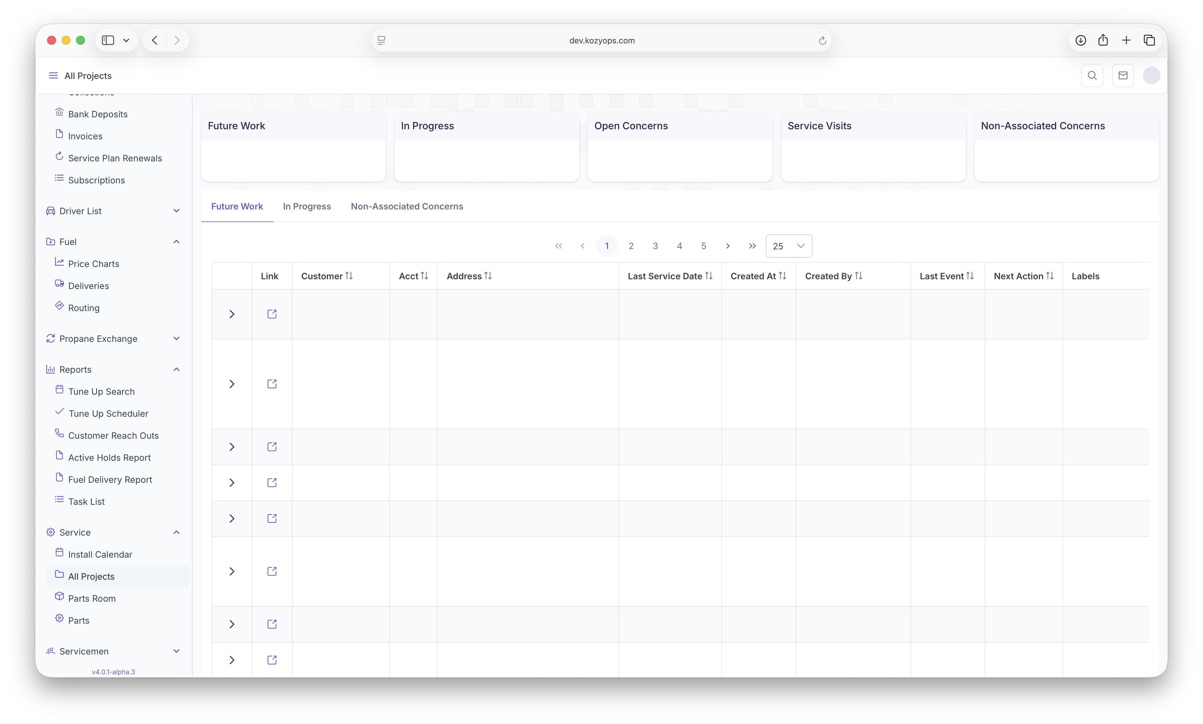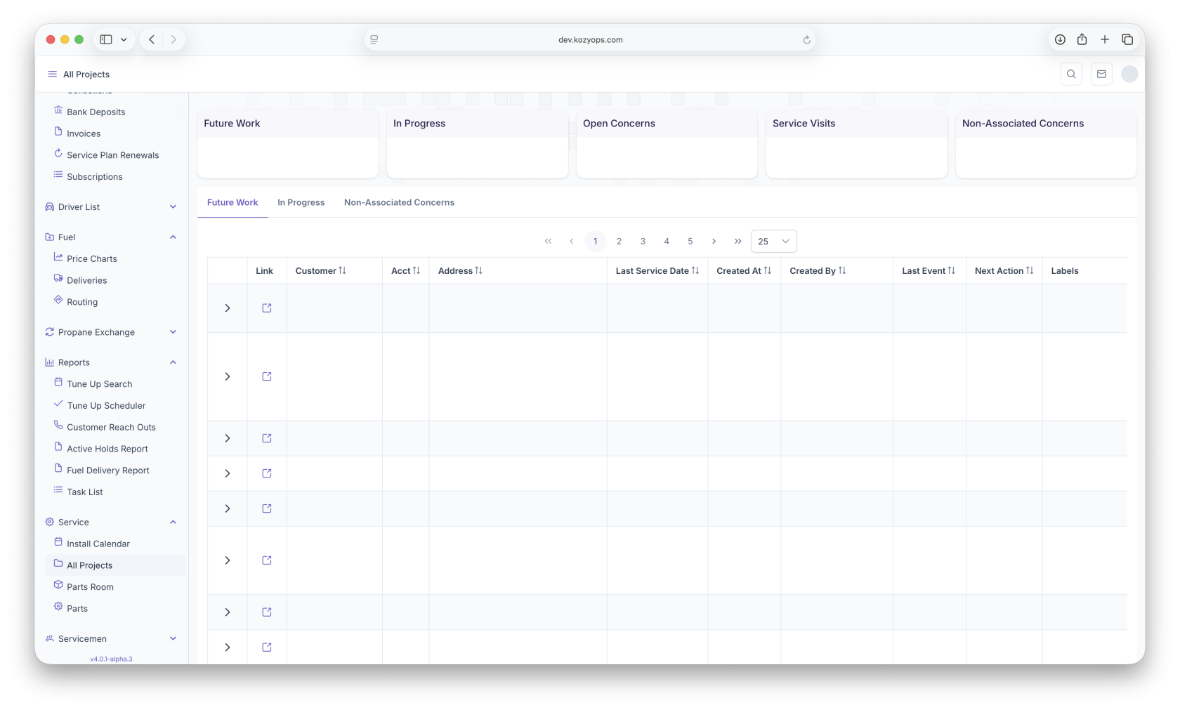 The All Projects Report shows all projects that are to being worked on, to be worked or have been worked. When opening page, you will see the Totals which include Future Work, In Progress jobs, Open Concerns, Service Visits and Non-Assciated Concerns. The following information is the provided, Links to each Customer Report, Customer Name, Account Number, Address, Last Service Date, Created Date, Created by, Last Event, Next Action and project labels. The report can also be sorterd by category by clicking on the arrows next to each said category