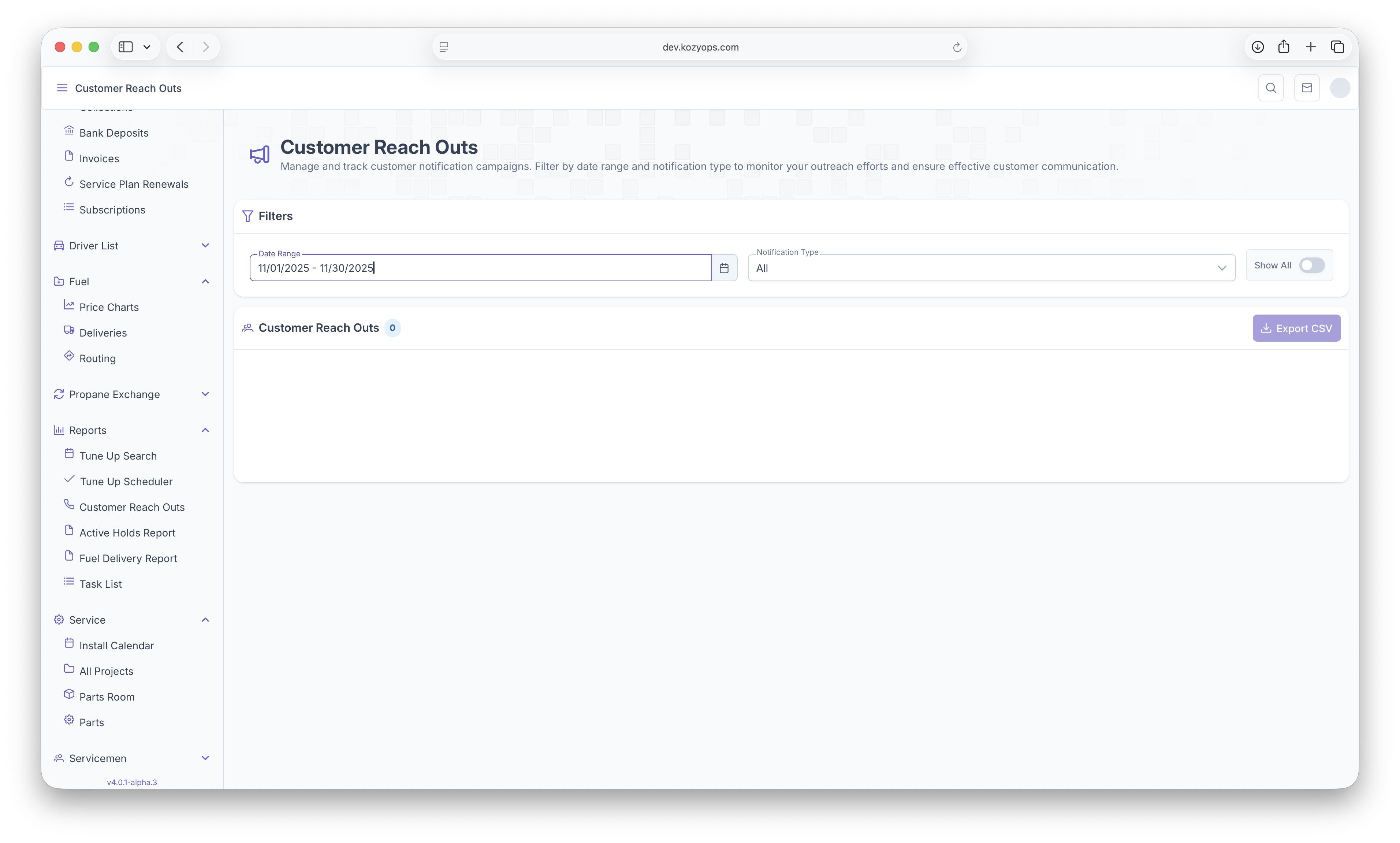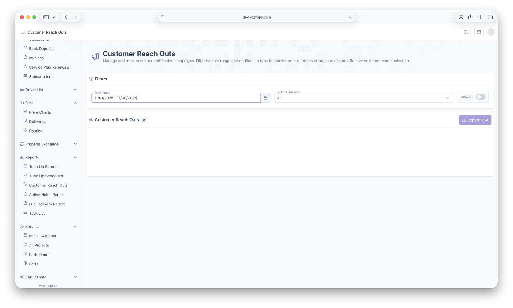 The Customer Reach outs Report is to show that the customer has been notified of any upcoming projects. The information can be pulled up byt setting the date range and Notification Types. The following information then appears, Account Number, Customer Name, Address, Notification Type, Wheather an email has been sent and when it was created. Clicking on the account Number will bring you to the customer page if more specific information is need including any comments, Phone Number, etc.