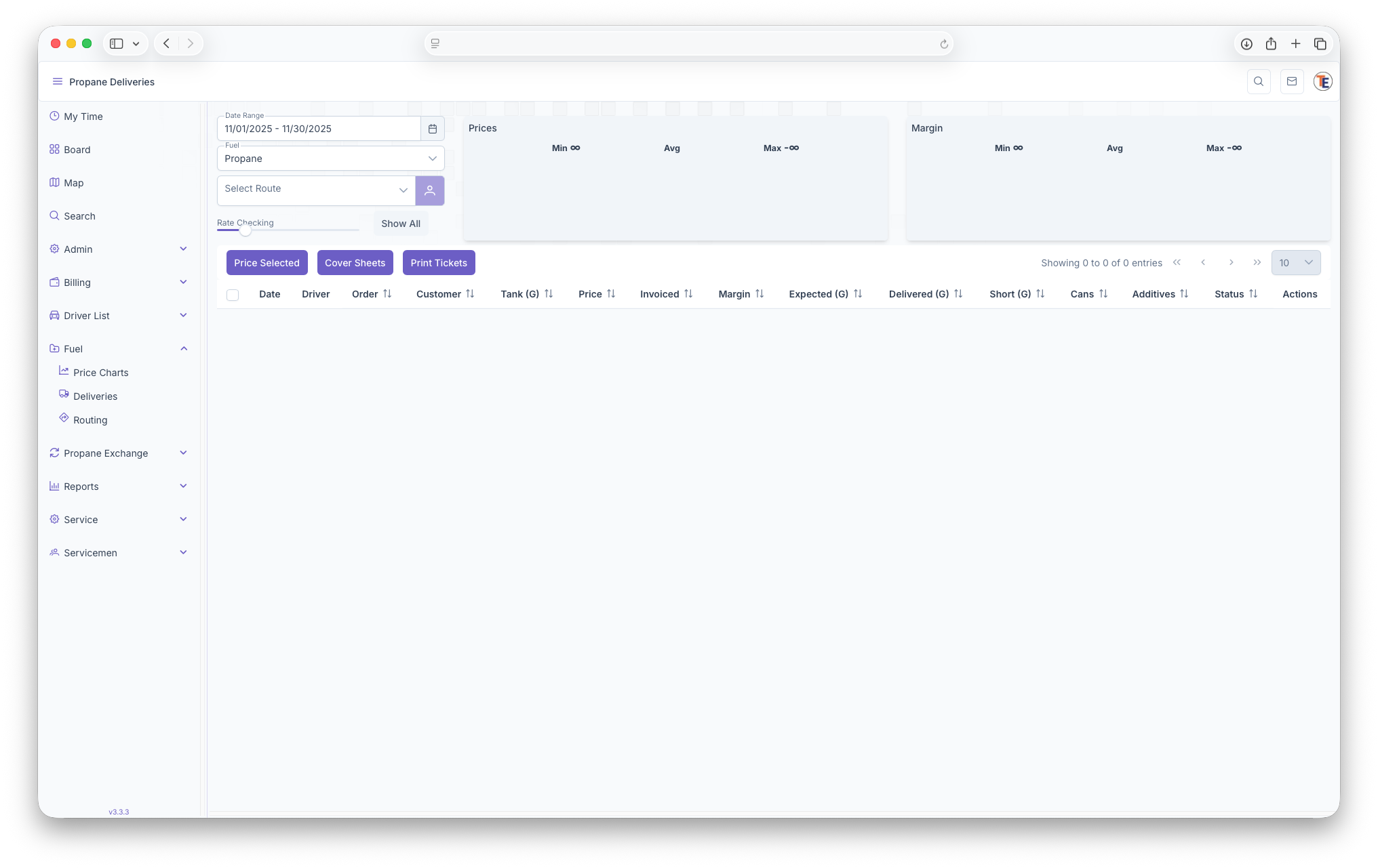 The Deliveries Report page shows deliveries that have been routed and are being delievered, have been delivered, are going to be delivered or haven't been delivered. To reach the Delieveries page, on the side menu, click on the Fuel drop down, then select Deliveries. Clicking on the three bars on the top left corner of the page allows the side bar to be expanded for a more detailed view for easier access. Page can be filtered by Date Range, Fuel and Route. The page will then show Prices which show the Minimum Price, Average Price and the Max Price. The page will also show Margins that will then show the Minimum Margin, the Average Margin and the Maximum Margin. The report is then seperated into the following columns, Date, Driver, Order, Customer Number/Name, Tank, Price, Invoiced, Margin, Expected Delivery, what's been Delivered, Shortage, Cans, any Additives and current Status of the delivery. The option to price each delivery can be down by selecting a delivery and clicking on Price selected. Cover sheets and Tickets can be generated by clicking on Cover Sheets and Print Tickets buttons for easier printing and sharing